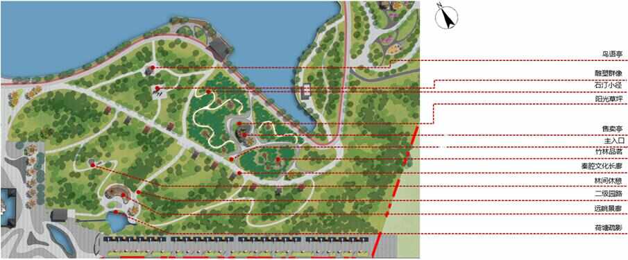 2、將現(xiàn)狀林帶及園路進行疏剪整理,提升林下空間,增設(shè)林間休憩等空間場所。