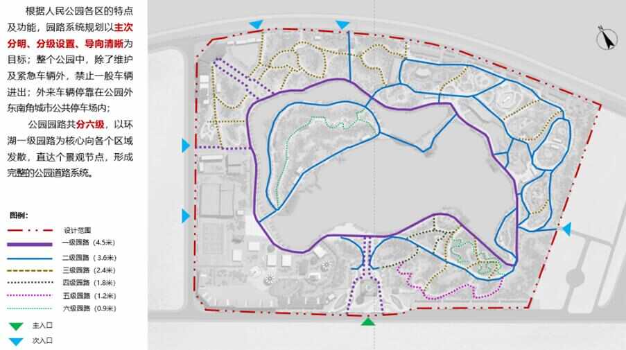 二、梳理規(guī)整現(xiàn)狀園路,根據(jù)寬度、主要功能分為六級園路。