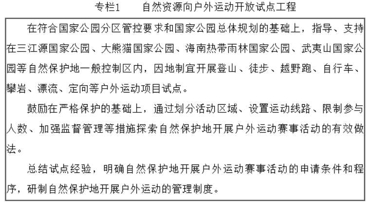 1. 推動自然資源向戶外運動開放。圍繞可利用的森林、草原、沙漠、湖泊、海灘海域等自然資源,在符合自然保護地、生態(tài)保護紅線相關(guān)法律法規(guī)、管控要求和項目準入制度的前提下,在部分有條件的國家公園、自然保護區(qū)、自然公園等自然保護地劃定合理區(qū)域開展自然資源向戶外運動開放試點,建立健全自然保護地開展戶外運動的監(jiān)管制度。