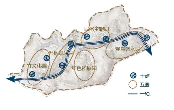 在廟陀半島產(chǎn)業(yè)空間布局上采用“點—園—軸系統(tǒng)”發(fā)展模式(見圖 4)。以水域為依托貫穿整體園內(nèi)濕地廊道作為濕地水域軸,各產(chǎn)業(yè)點分布于軸線周圍。同時結(jié)合區(qū)域環(huán)境、交通組織、地形等要素將整個廟陀半島旅游區(qū)域劃分為五個游覽園區(qū):竹文化園、濕地觀光園、紅色拓展園、民俗鄉(xiāng)野園、觀鳥親水園。將產(chǎn)業(yè)點與游覽園區(qū)相互結(jié)合,促進“竹產(chǎn)業(yè)+旅游業(yè)”產(chǎn)業(yè)模式的發(fā)展。