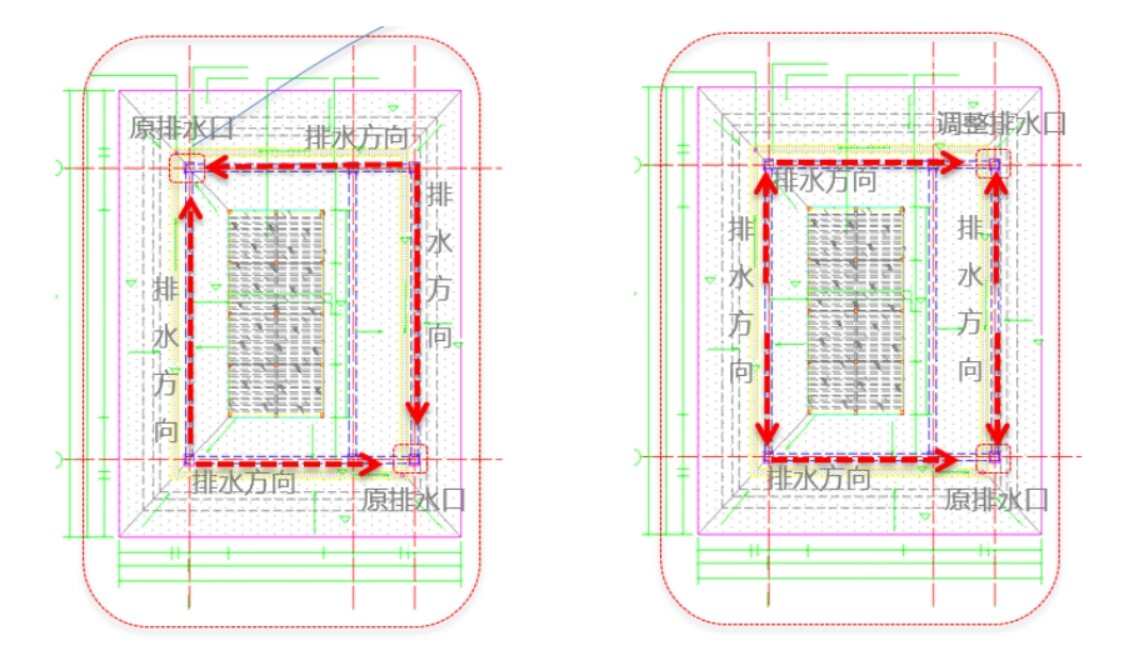 ■應(yīng)對(duì)策略:越是需要隱蔽處理的工程越關(guān)鍵。落水管的隱蔽處理涉及了不同的專業(yè)(水專業(yè)與鋼結(jié)構(gòu)專業(yè)),為避免返工等資源浪費(fèi),需要在前期對(duì)設(shè)計(jì)、工序等進(jìn)行交流與調(diào)整。如下圖所示,原設(shè)計(jì)的排水方式不利于施工,且由于落水管外露影響美觀。我們結(jié)合廊架的結(jié)構(gòu)形式,對(duì)排水方向和布置進(jìn)行了調(diào)整,并對(duì)外露的落水管進(jìn)行了隱蔽處理。