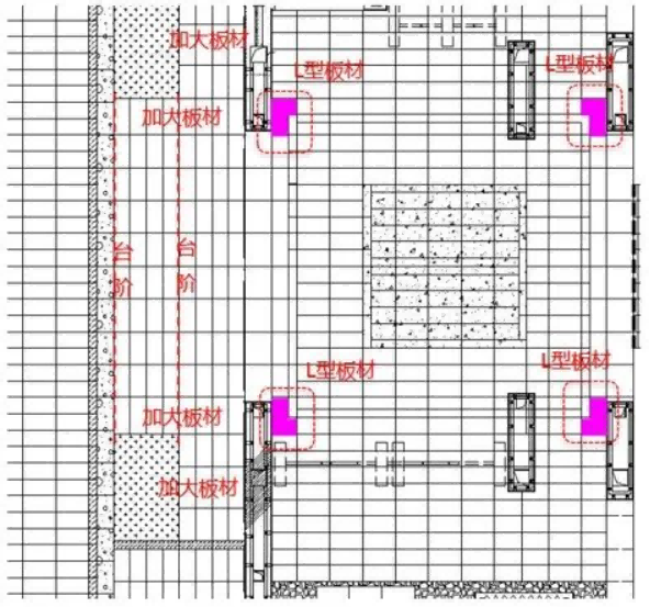 ■應(yīng)對(duì)策略:在前期對(duì)圖紙進(jìn)行審核、并在圖紙上確定鋪裝控制線、關(guān)系復(fù)雜的可以結(jié)合模型進(jìn)行審核;在中期鋪裝排版確定后,制作下料單,并考慮縫寬對(duì)材料加工的影響;在后期依據(jù)之前的思路,對(duì)現(xiàn)場(chǎng)進(jìn)行管理:技術(shù)交底、放線、標(biāo)高、支模與面層鋪裝等。