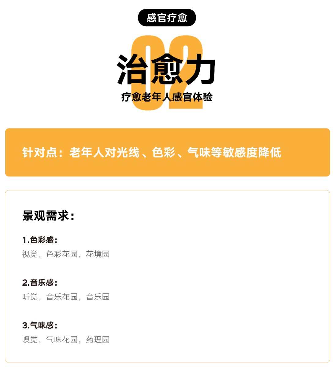 我們抓住康養(yǎng)的內(nèi)核所在,從5大層面來研究和實(shí)踐(包容性,治愈力,豐富性,共情力,針對(duì)性)如何讓老人在我們的景觀設(shè)計(jì)中保有健康,感受快樂,生活的平靜和安詳,這是一場(chǎng)關(guān)于身、心、神的設(shè)計(jì)休養(yǎng)!