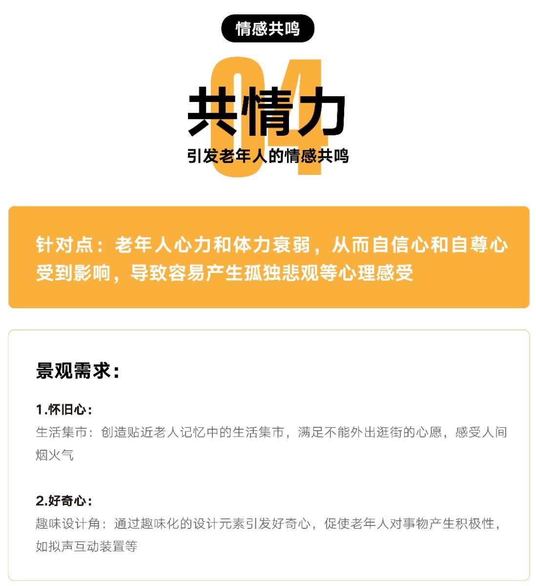 在城市化進(jìn)程不斷加快、人口老齡化愈演愈烈,老年人需求更加多樣化的大背景下,引發(fā)更大的養(yǎng)老問題得到越來越多人的關(guān)注和思考。人進(jìn)入老齡的時(shí)候,身體會(huì)發(fā)生巨大改變,尤其在感官能力和行動(dòng)能力上。需謹(jǐn)慎考慮什么樣的活動(dòng)既有趣又能在他們的力所能及的范圍之內(nèi),這些情況很大程度上取決于我們的設(shè)計(jì)和環(huán)境是否能夠支持這樣的活動(dòng)。