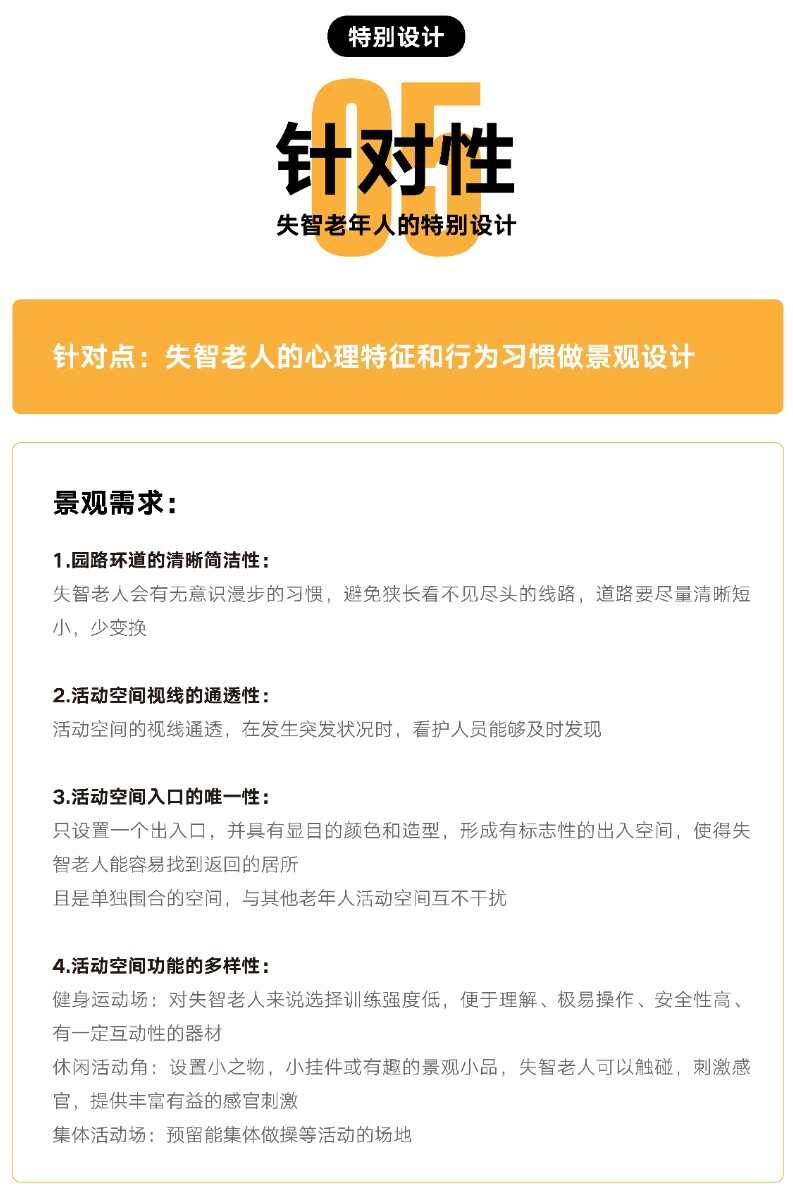 設(shè)計(jì)師們除了在考慮一般適老性景觀,更是需要針對(duì)這方面老人的行為和心理特點(diǎn),打造符合他們的需求的空間。既能提升這部分特殊人群的生活環(huán)境,又能讓他們感覺自己是像正常人一樣受尊重和無差別對(duì)待,這是個(gè)難點(diǎn)。