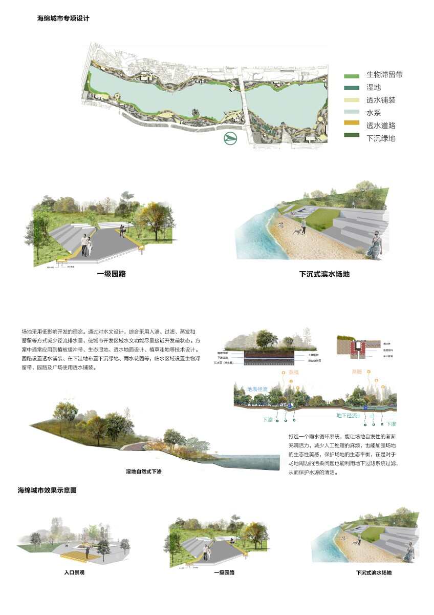 方案引入了“海綿城市”設(shè)計(jì)理念,其是新一代城市雨洪管理概念,是指城市能夠像海綿一樣,在適應(yīng)環(huán)境變化和應(yīng)對(duì)雨水帶來的自然災(zāi)害等方面具有良好的彈性,也可稱之為“水彈性城市”;好處是下雨時(shí)吸水、蓄水、滲水、凈水,需要時(shí)將蓄存的水釋放并加以利用,實(shí)現(xiàn)雨水在城市中自由遷移。