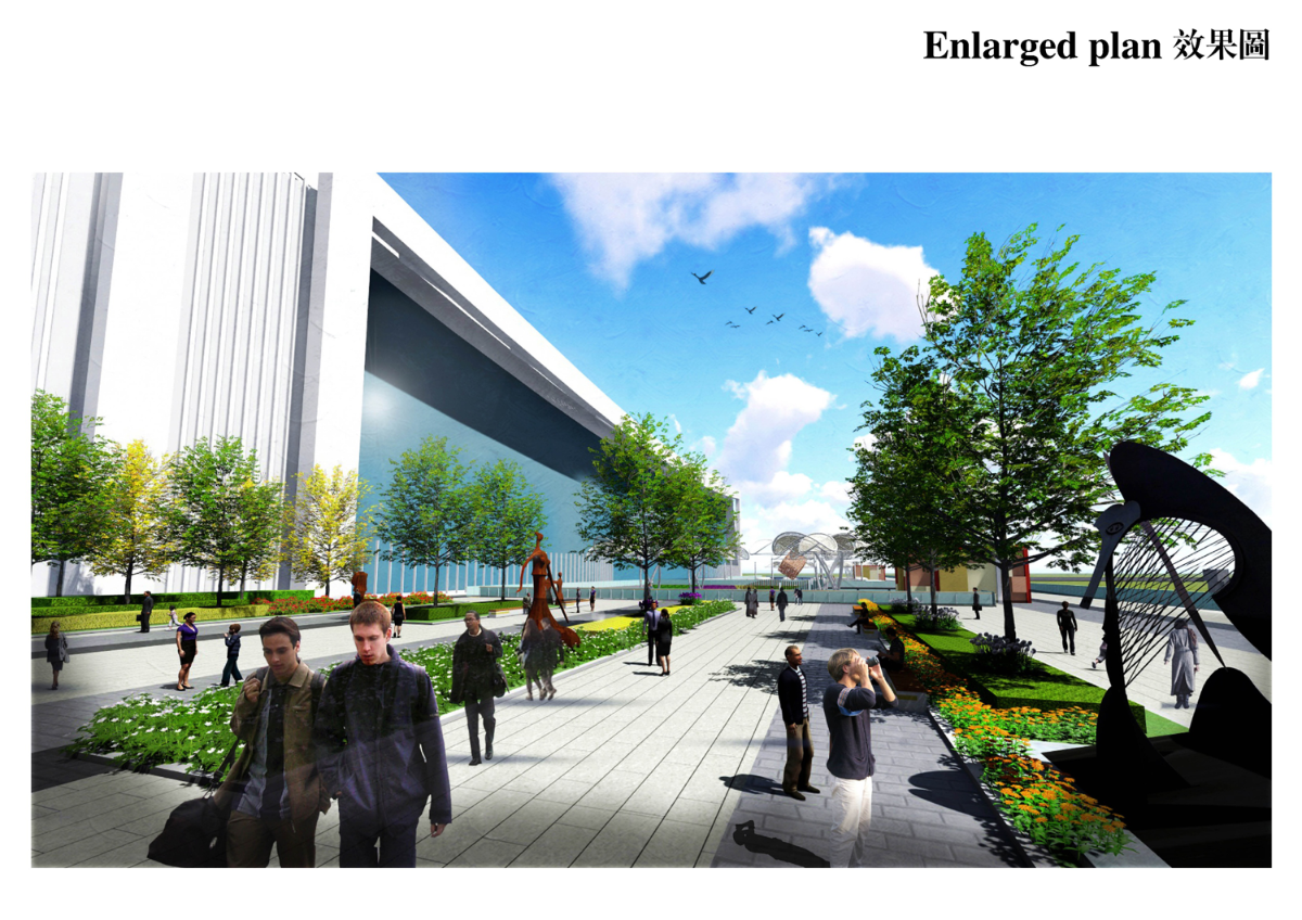 重點考慮人車分流和安全疏散,將機動車和非機動車停車場集中布置于場地因邊,尤其是考慮到主體建筑瞬時人流量很大的特殊性,設(shè)計了多個便于交通疏散的小廣場。同時,還對景觀節(jié)點的各個使用時間段,不同人群的行為活動進(jìn)行分析,實現(xiàn)廣場 24小時的活力。