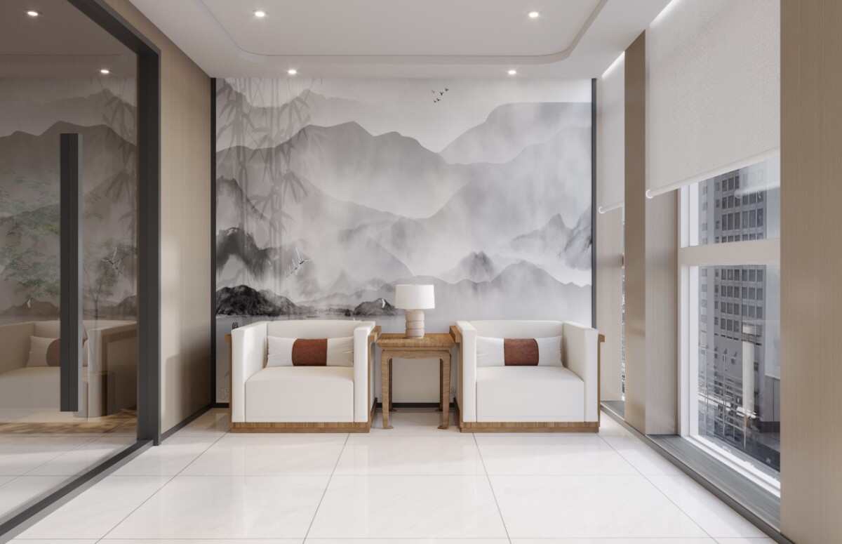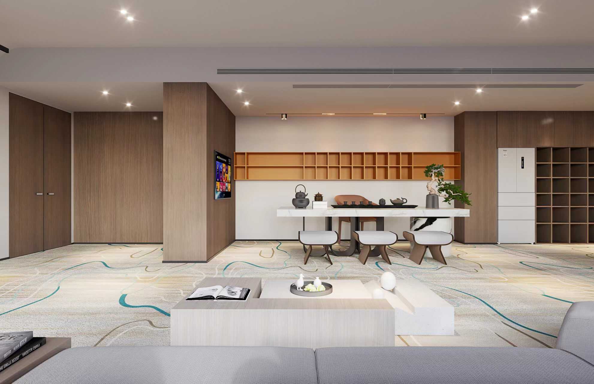 以木色系為主調,旨在為接待大廳打造自然溫馨的氛圍。深木色的護墻板增加空間層次感,營造出溫潤、舒適的視覺感受。