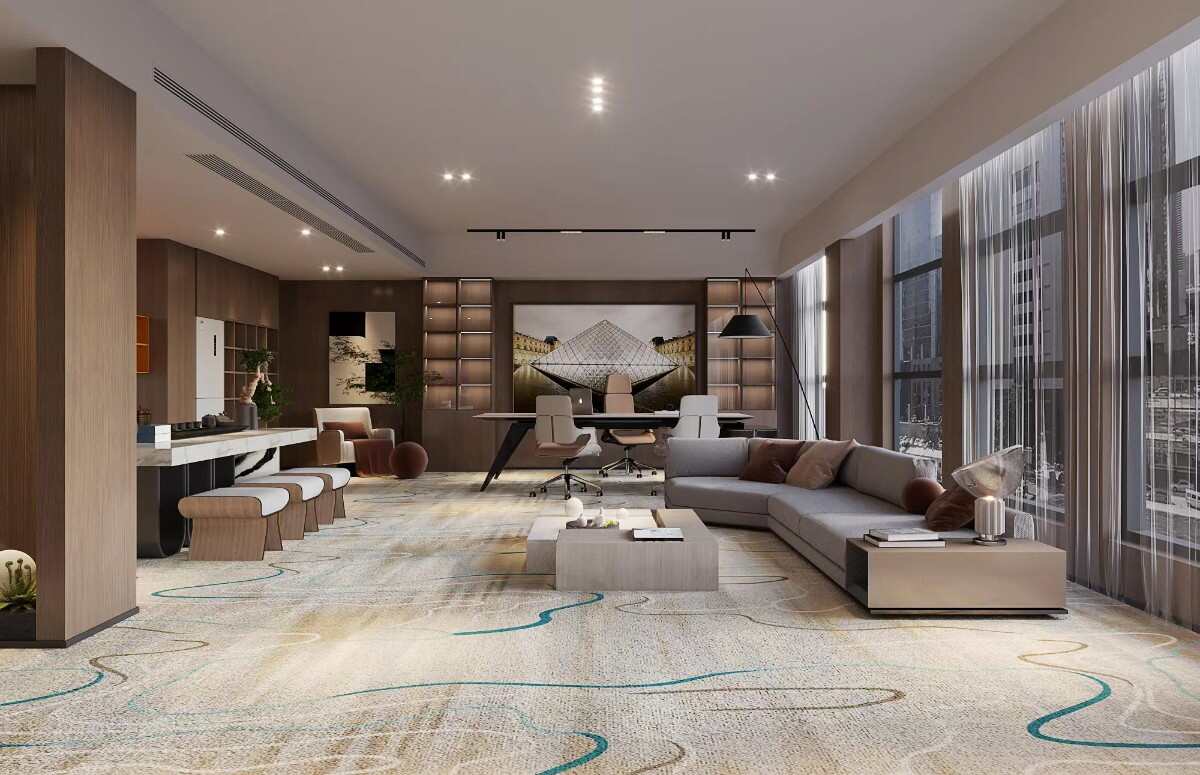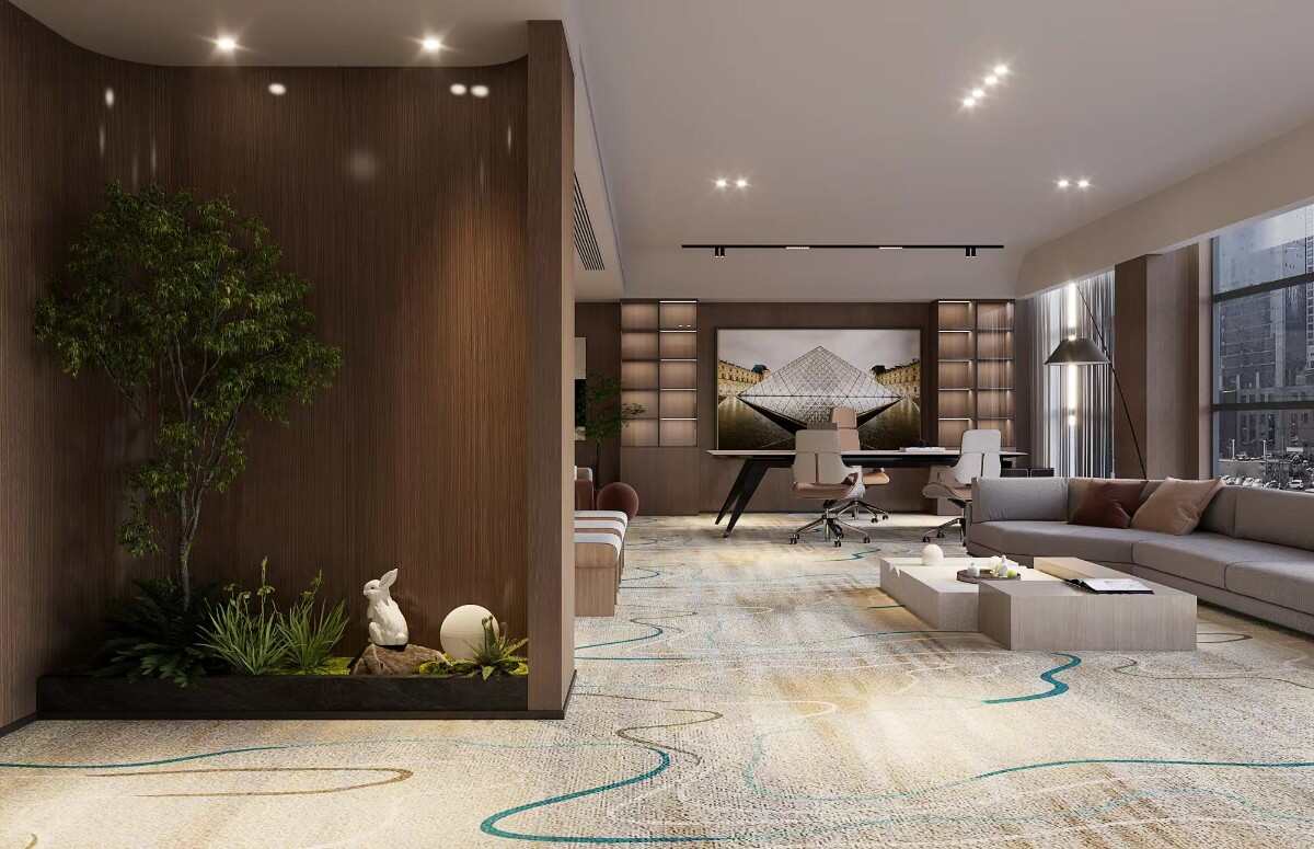 放重要文件與彰顯品味的書籍,體現老總的工作核心地位。會客區(qū)采用沙發(fā)、茶幾組合,布置在靠近入口且相對開闊的區(qū)域,