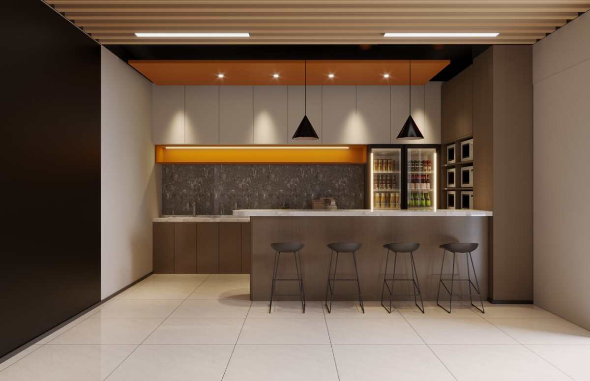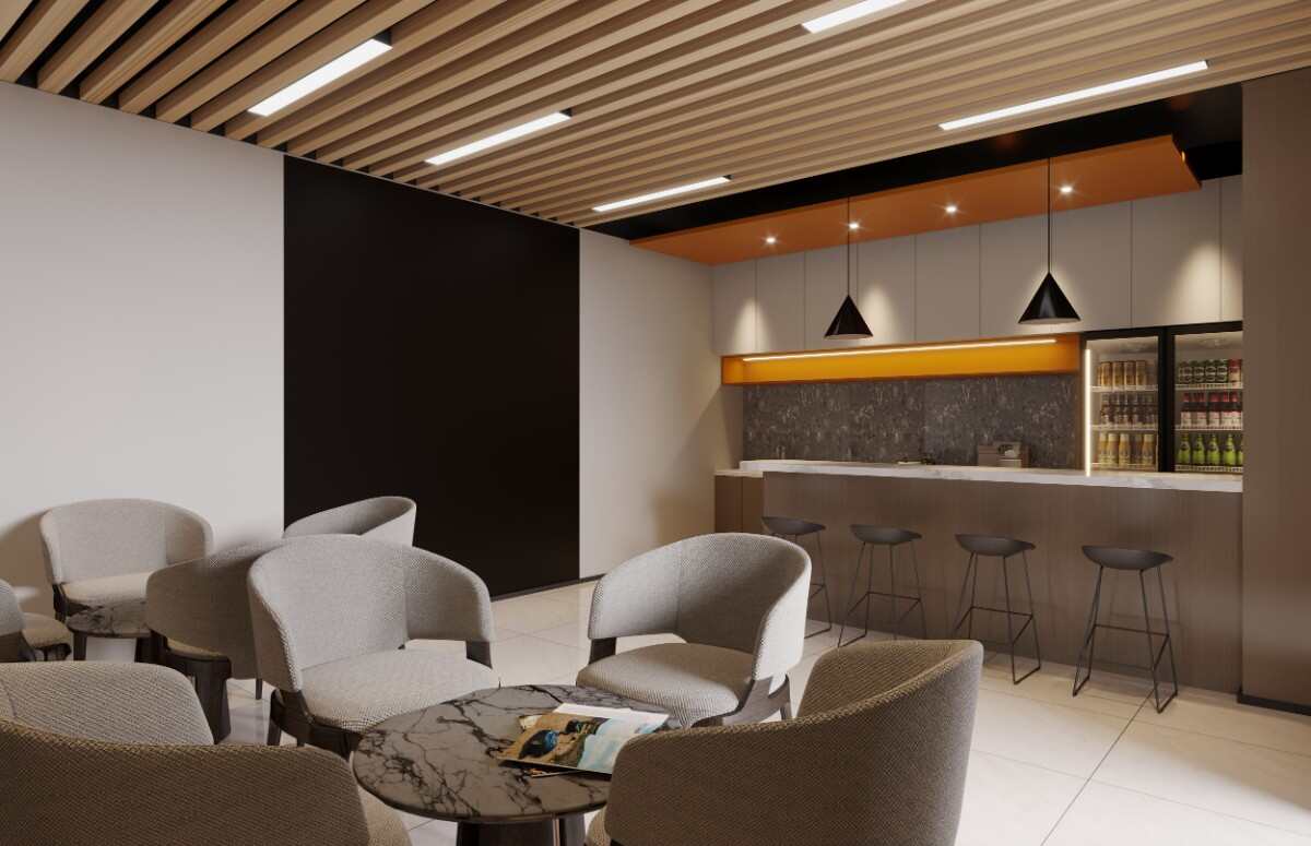 休閑交流區(qū)放置高腳椅、休閑桌椅,為員工提供舒適的休息與交流空間。