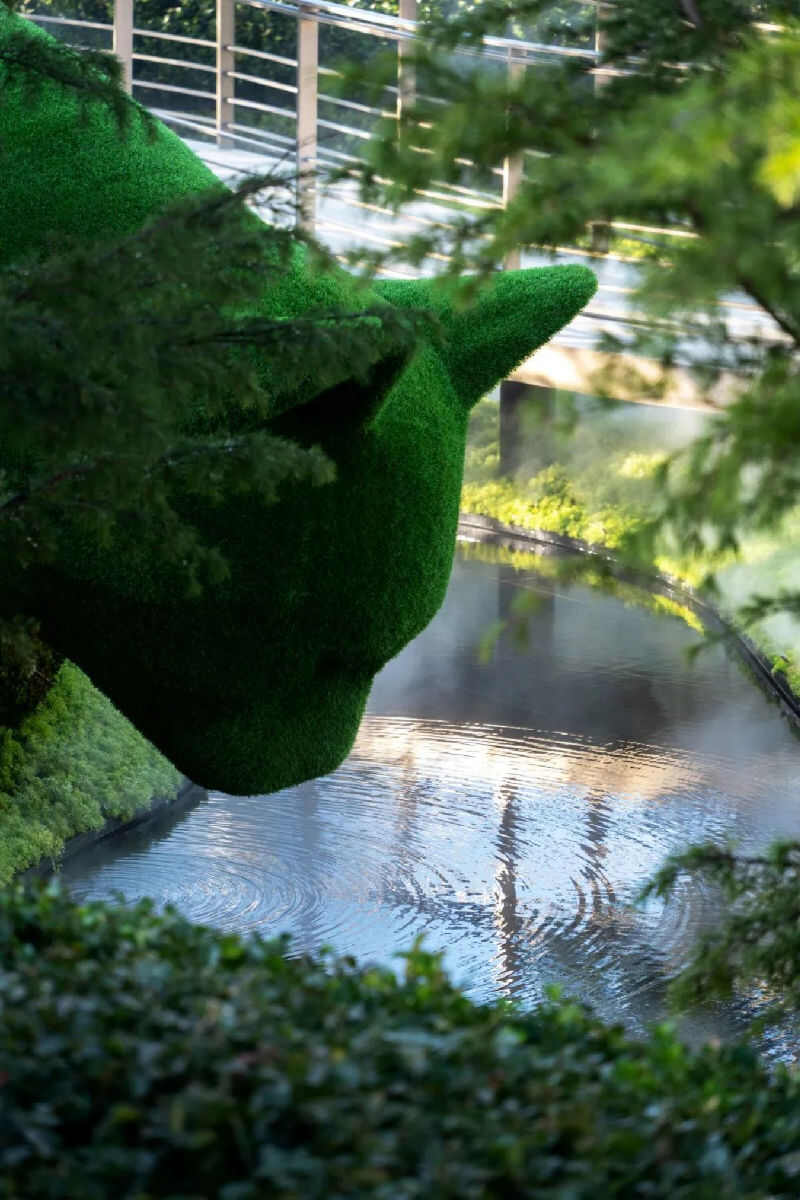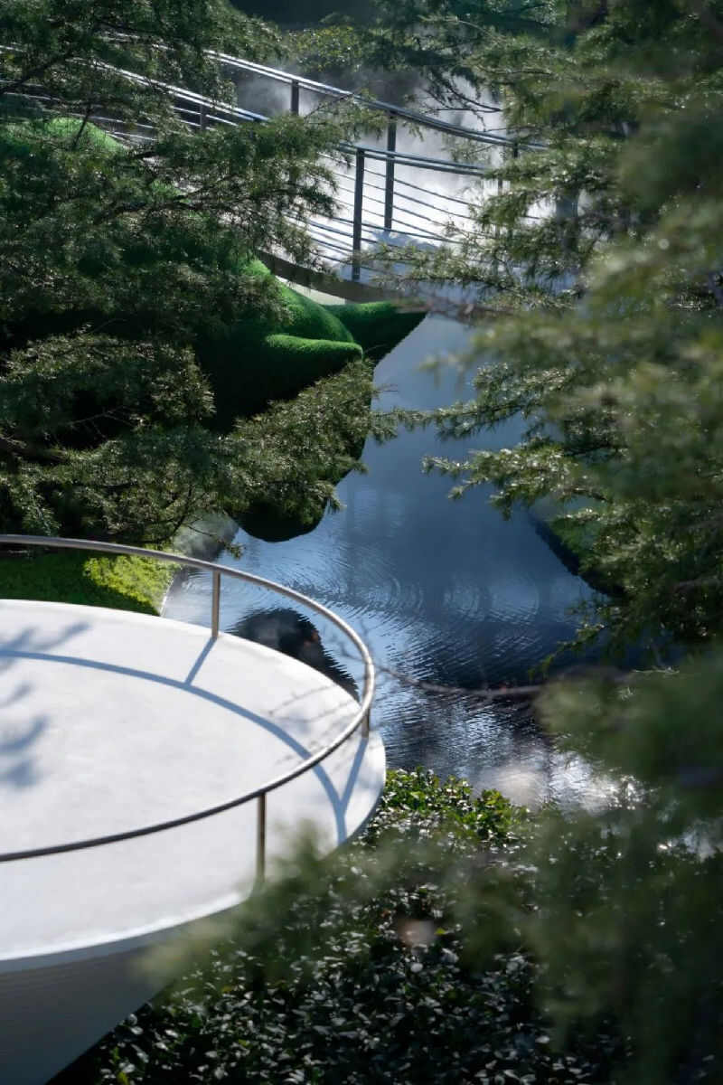 沿橋漫游,坐在沙發(fā)看臺上欣賞綠谷,粼粼水波淺嵌著蜿蜒綠島,陽光透過雪松枝葉灑向水面,是都市中不可得的美好情景。
