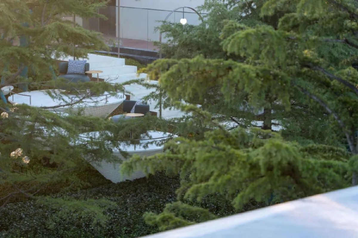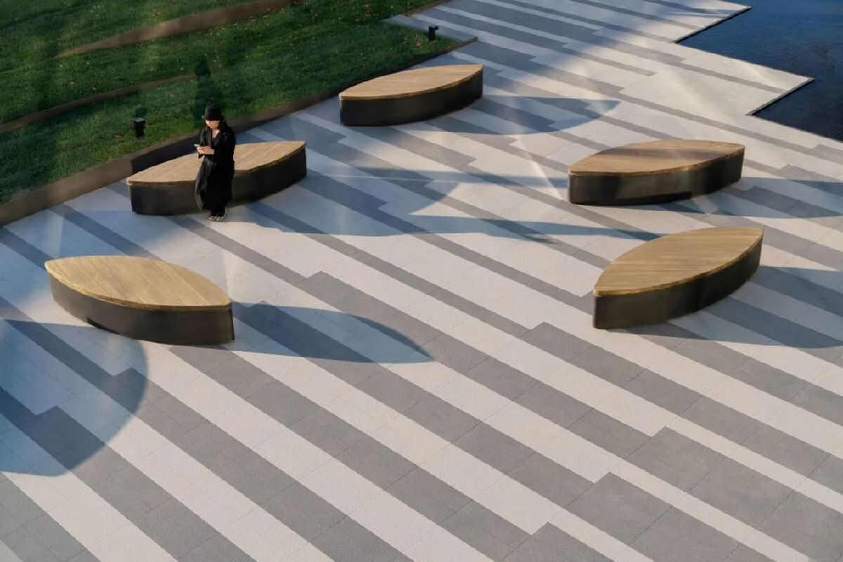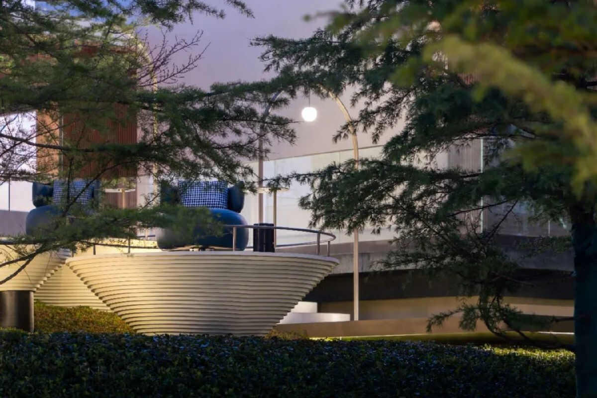 初視入口迎面而來的是層層疊疊的綠籬波浪,分割市政道路與入口廣場的空間界限,為前場空間界面豐富了層次變化,也意指日出日落土地上的光波流轉。場地上散置葉片形狀的座椅,營造童話氛圍的同時滿足休憩交流功能,增添了場地趣味性與活躍感。