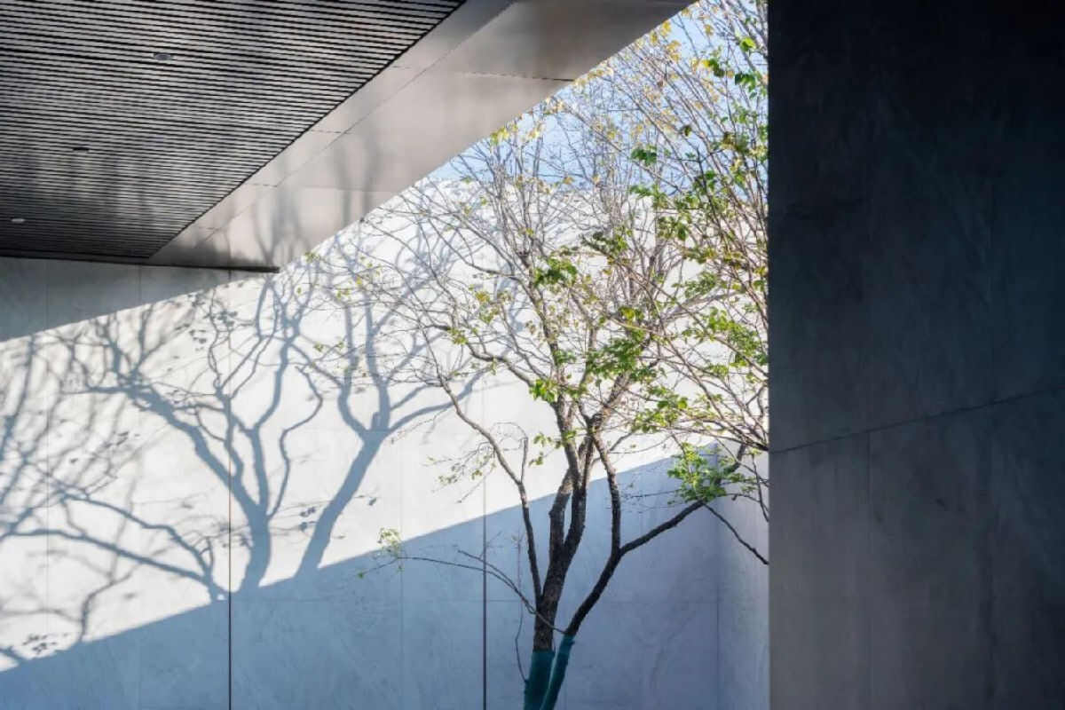 簡單的幾何體量搭接,縫隙窺探中為空間闡述了一種新的氛圍,特選造型植物營造一種向上而生的力量,也讓空間更有穿透力。視野,美感,石材、光影,一切都符合理想,空間里大膽展示了對光的偏愛,植物的影子映在墻面,使空間產生一種沉穩(wěn)呼吸的質感.
