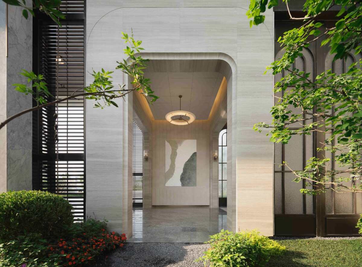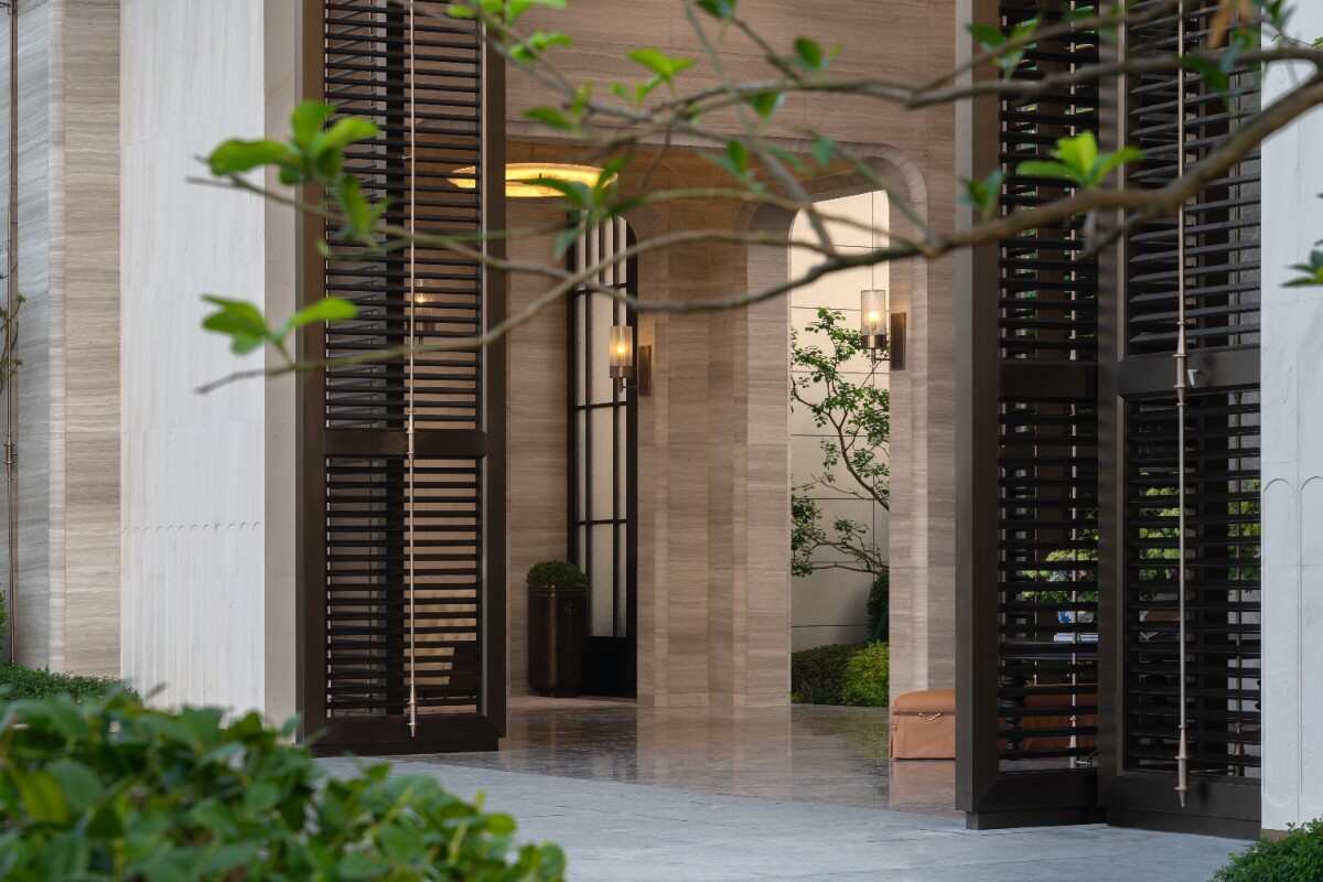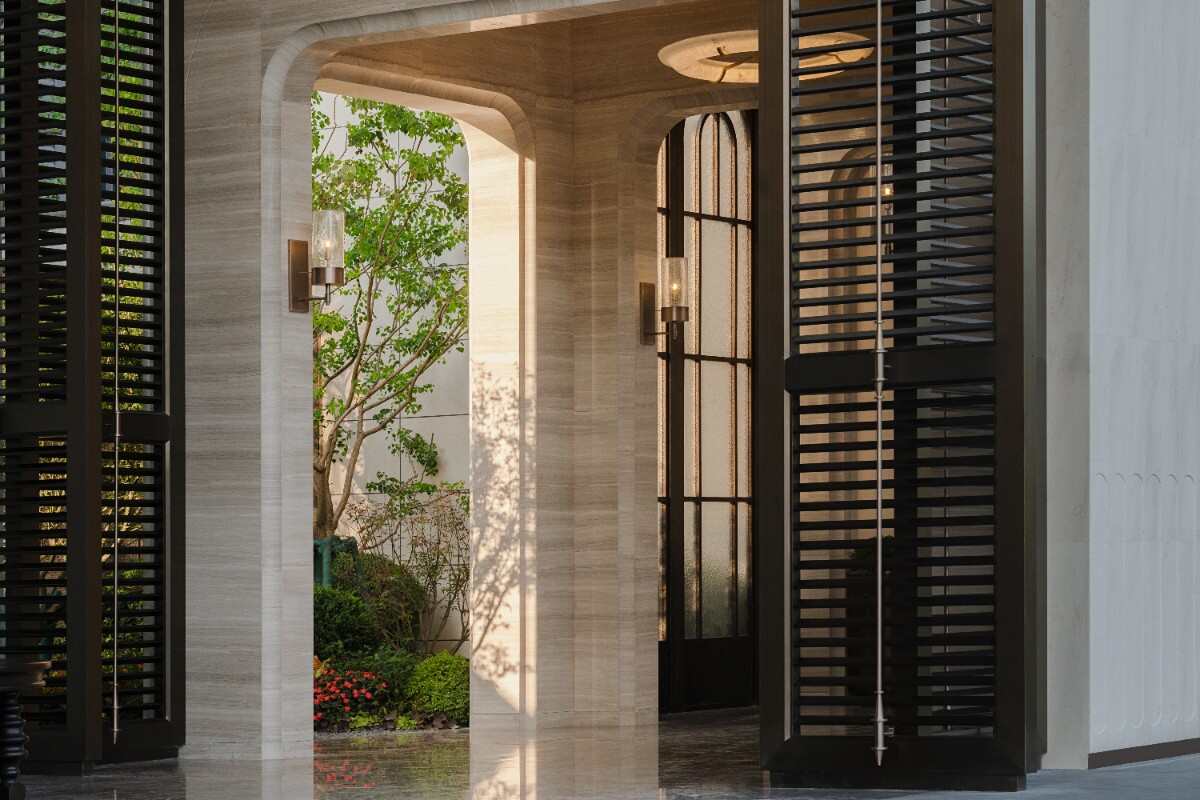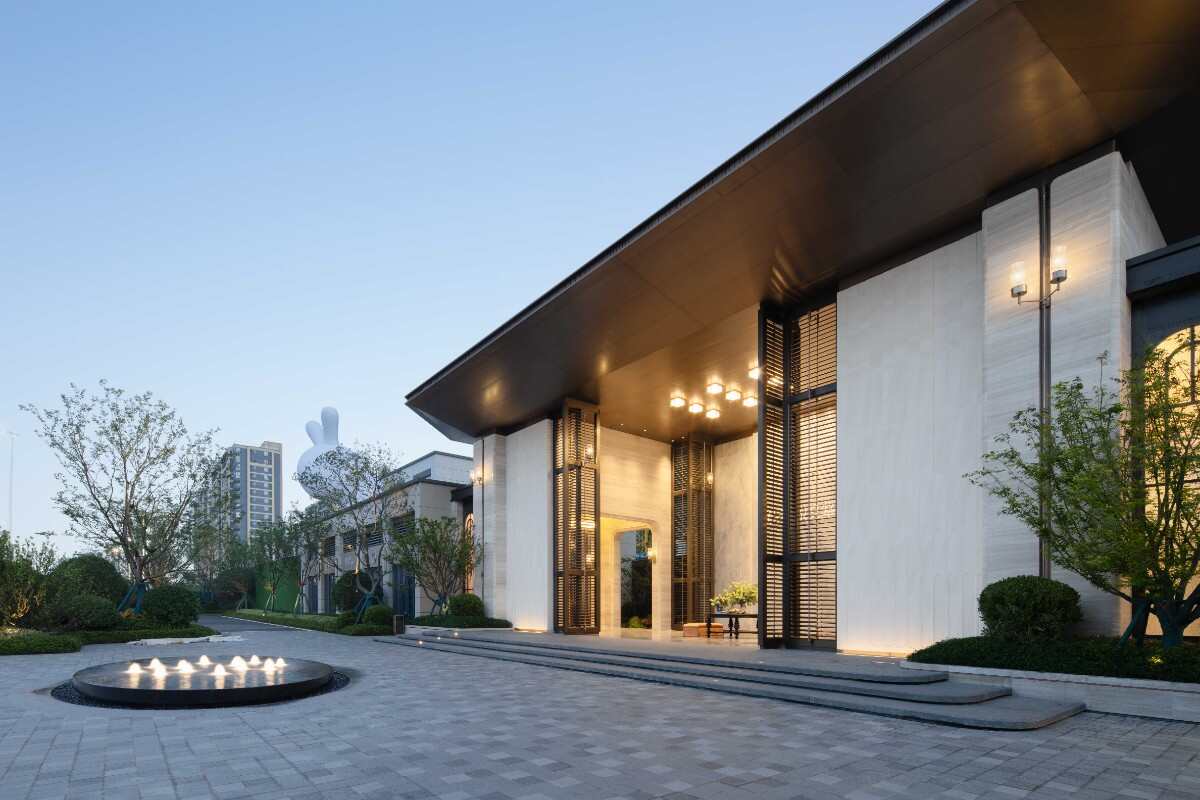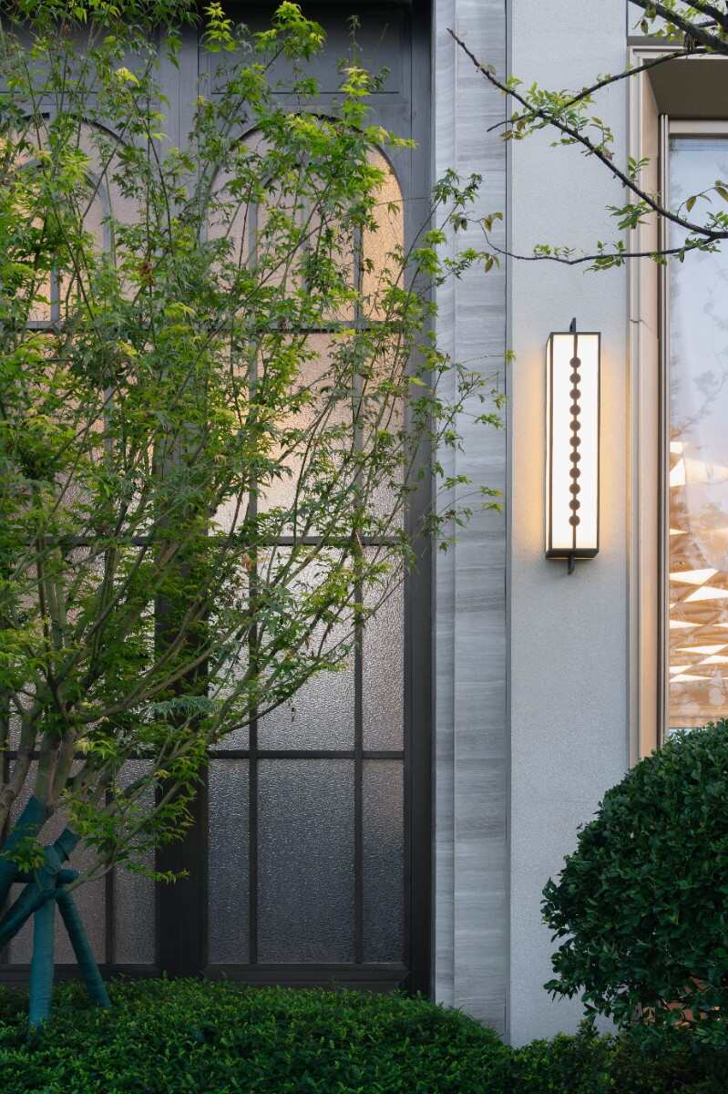 入口輕奢典雅,通過精致的墻體細(xì)節(jié),酒店式的名牌,鏡面水景和比較克制的綠化烘托出入口迎賓的感受