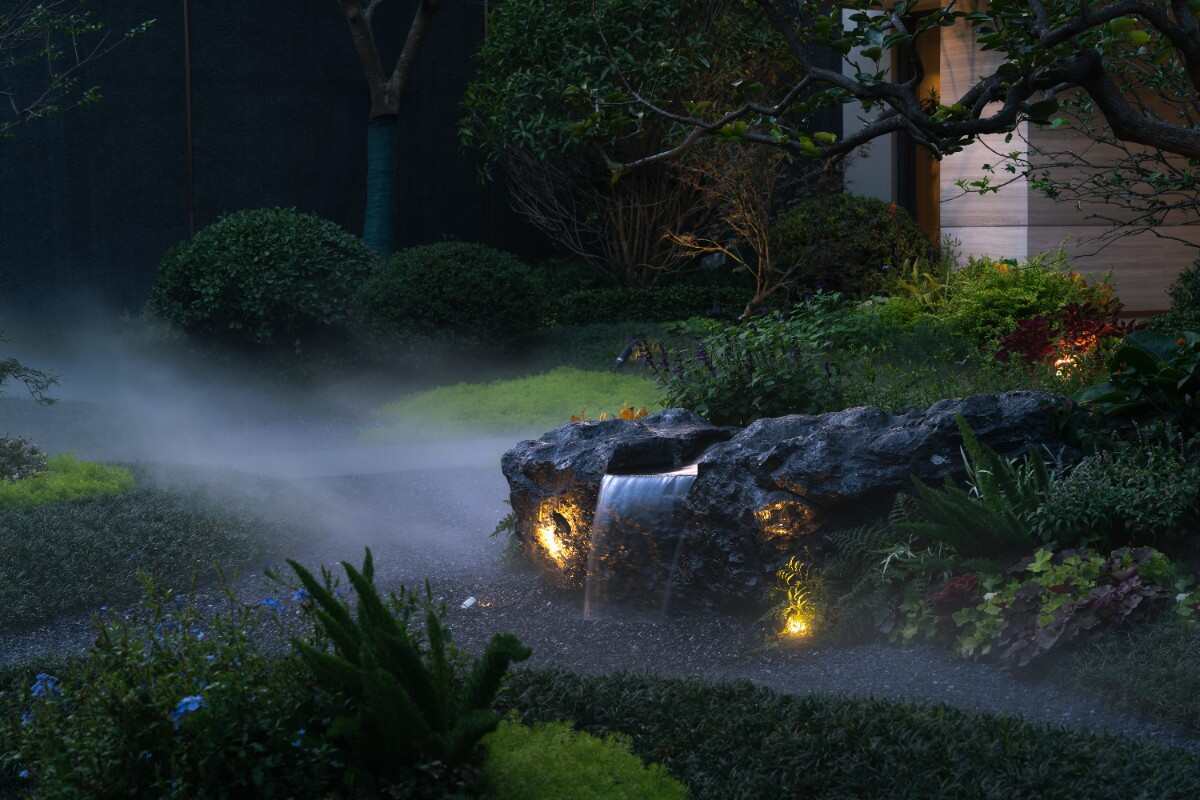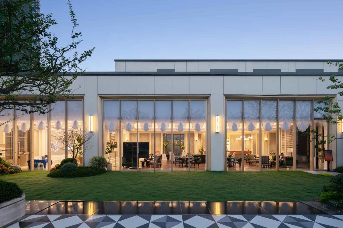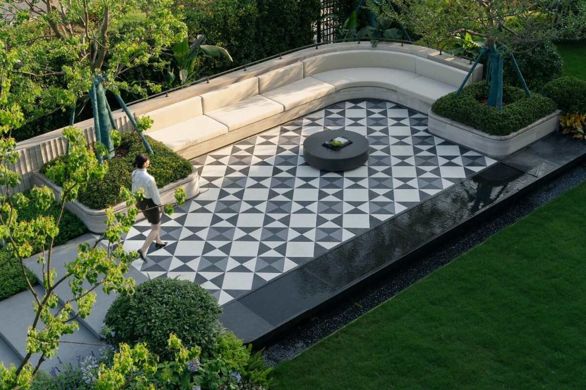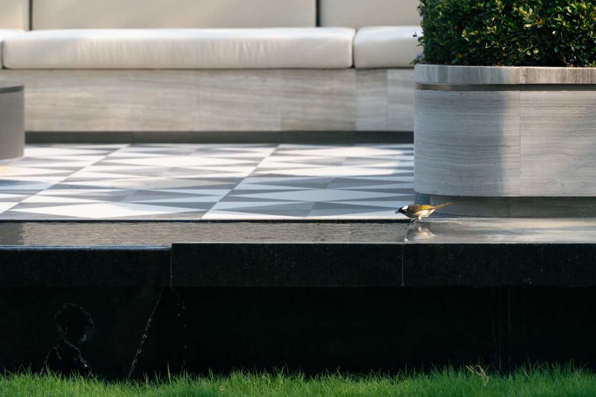 通過蜿蜒的花鏡空間,來到卡座區(qū),平臺(tái)采用了特色裝飾性鋪裝,延續(xù)輕奢酒店感,在一側(cè)設(shè)置鏡面水臺(tái),松軟親膚的布藝卡座,和周邊種植形成一個(gè)靜謐場(chǎng)所。讓人在這個(gè)空間感受度假的歡愉心境。