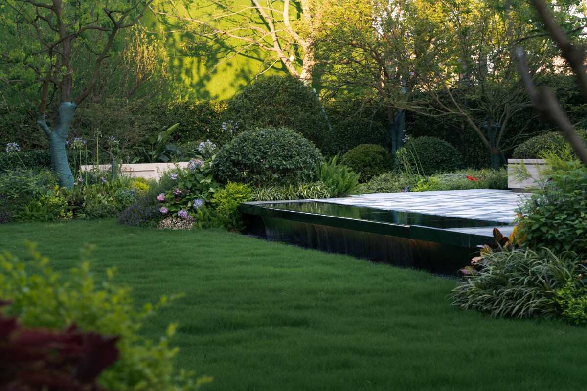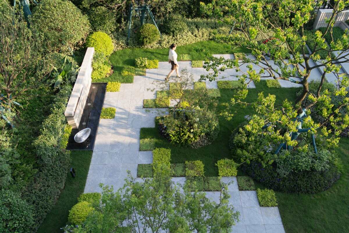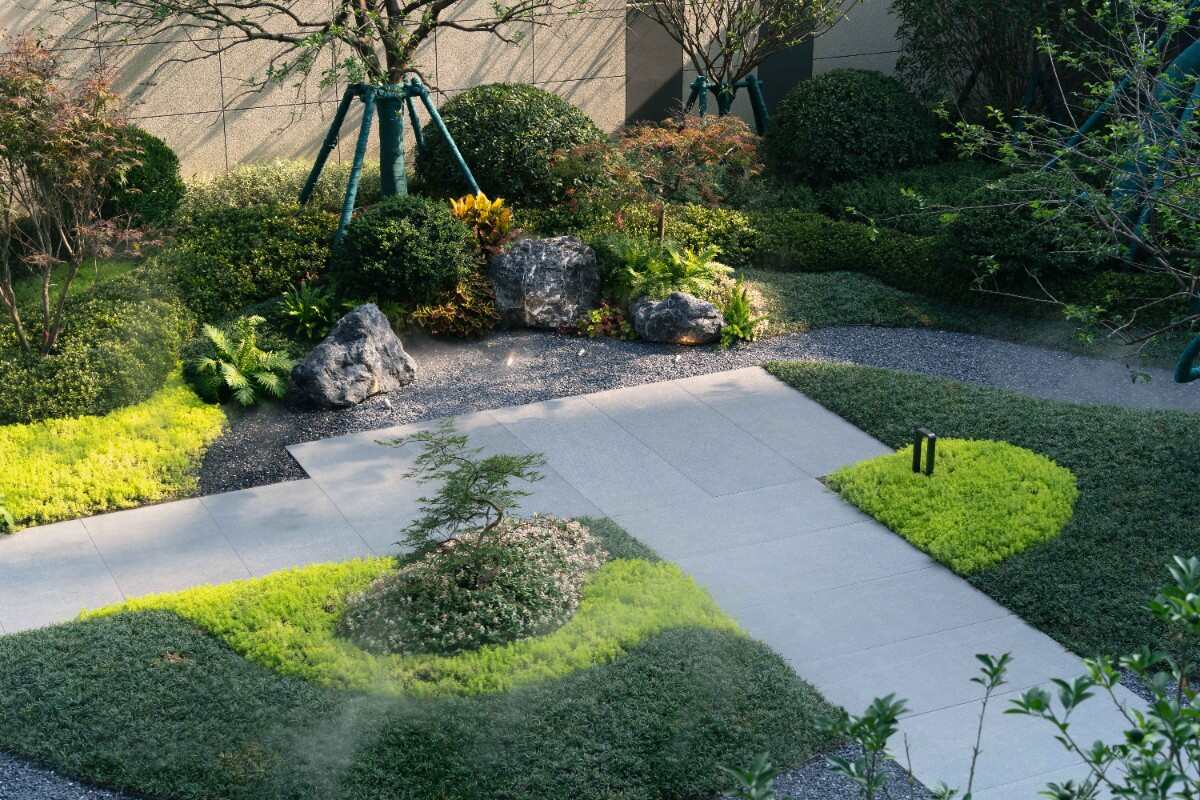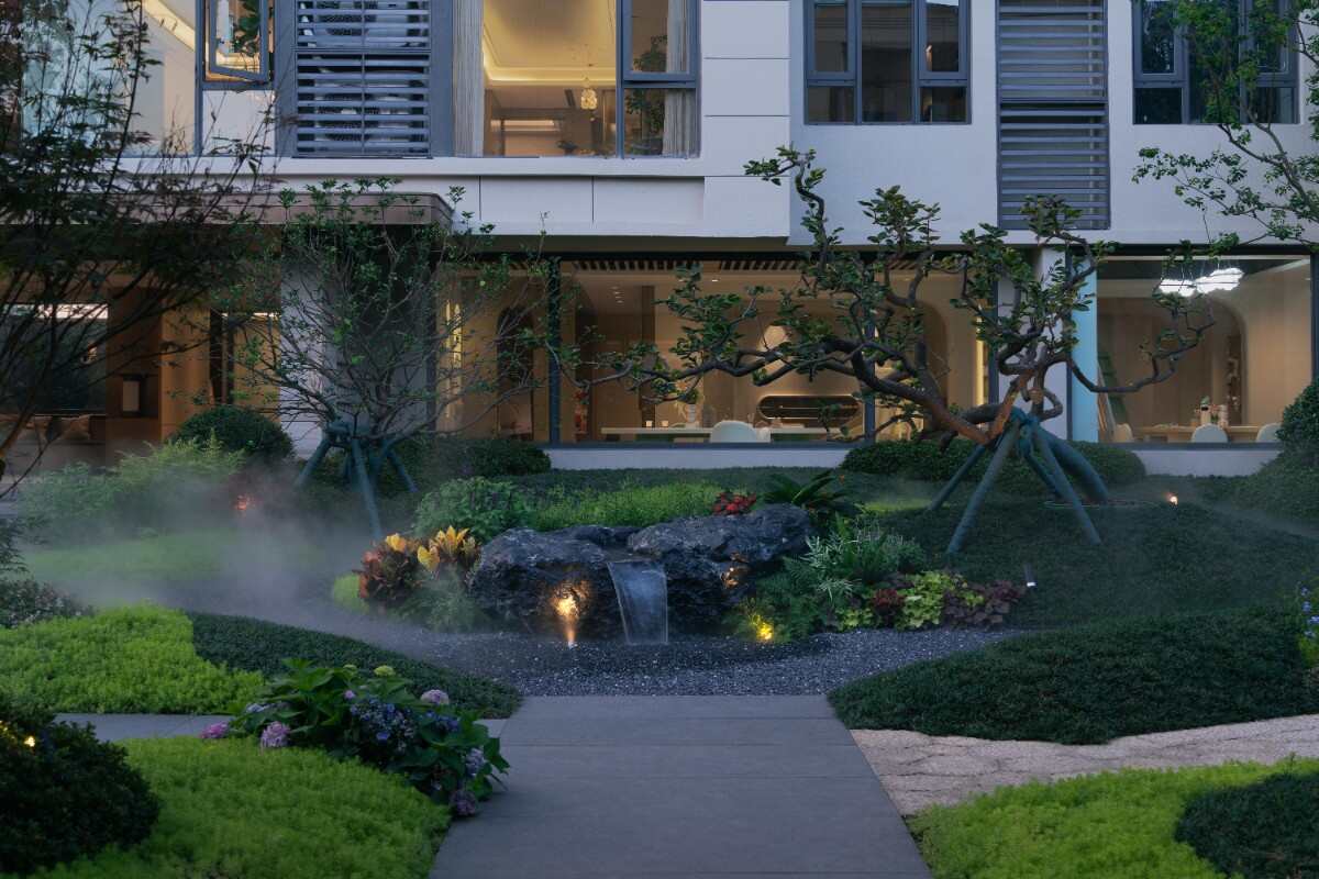 窗景構(gòu)成一個(gè)較為私密的酒店式花園。給人一種典雅輕松的景觀映像。整體景觀節(jié)奏做了一些起承轉(zhuǎn)合的空間,包括視覺焦點(diǎn)是一個(gè)舒適的輕享酒店式下午茶空間