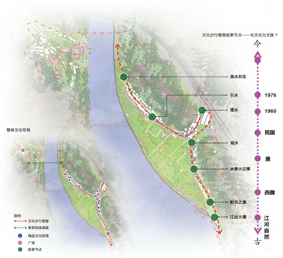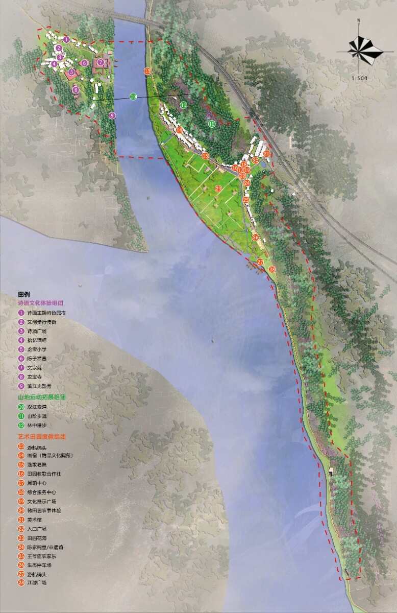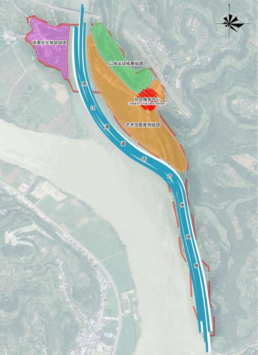 本項目位于遂寧市下轄的射洪市廣興鎮(zhèn)雙江村,處于涪江、梓江交匯處,通過村道北接子昂故里景區(qū),南接通射洪市城區(qū),東接成渝環(huán)線高速出入口,具有良好的資源稟賦和產(chǎn)業(yè)基礎(chǔ)。項目規(guī)劃總體定位為全國鄉(xiāng)村振興示范點、四川省美育研學基地、射洪市“兩江畫廊”文化會客廳。項目形象定位為“山水畫廊·藝術(shù)雙江”、“兩江漫田疇·詩酒載鄉(xiāng)愁”。規(guī)劃以“服務+景觀+業(yè)態(tài)”模式構(gòu)建區(qū)域“113”鄉(xiāng)村振興整體格局,即一個綜合服務中心、一條兩江漫道活力休閑帶,及詩酒文化深度體驗、藝術(shù)田園度假、山地運動拓展三個組團。在產(chǎn)業(yè)振興上,規(guī)劃以鄉(xiāng)旅研學和文創(chuàng)產(chǎn)業(yè)為主,山地體育產(chǎn)業(yè)為輔,植入庭院經(jīng)濟、夜間經(jīng)濟等新型業(yè)態(tài)產(chǎn)業(yè)項目,實現(xiàn)產(chǎn)村一體,一區(qū)一業(yè),同時以景留人,打造創(chuàng)意和本土文化相結(jié)合的鄉(xiāng)土特色景觀。在文化振興上,通過梳理規(guī)劃區(qū)文化內(nèi)涵和歷史節(jié)點,化文化為文脈,重構(gòu)文化空間格局,構(gòu)建“一巷一廊十院四廣場”的文化空間體系,即文化步行慢巷、景觀視線通廊、十大精品文化院落、四大主題廣場。在生態(tài)振興上,重視土壤保護和水土流失防治,突出林地生態(tài)保護功能,注重保護動植物的多樣性,注重水體的保護利用,規(guī)劃在涪江、梓江岸線兩側(cè)設(shè)置禁止建設(shè)區(qū)。在組織振興上,強化基層社區(qū)管理,注重精神文明建設(shè)。在人才振興上,通過政策制定和宣傳,吸引外來人才,引導能人返鄉(xiāng)。