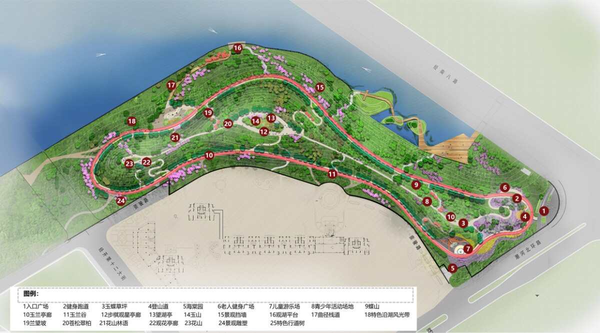 該項(xiàng)目位于濱河新城門戶地帶,經(jīng)南八路大橋南側(cè),原場地綠化效果欠佳且公共休閑空間匱乏。設(shè)計(jì)團(tuán)隊(duì)以“玉蝶穿花”為主題,充分挖掘場地特色,通過“一軸三心多點(diǎn)”的整體布局,打造出集文化展示、地標(biāo)景觀和綠色活動(dòng)空間于一體的示范性公園。在設(shè)計(jì)中巧妙運(yùn)用玉帶、蝴蝶、花瓣元素,將場地劃分為活力休閑區(qū)、游覽觀景區(qū)和靜謐叢林區(qū),并融入智能化設(shè)計(jì),提供了一處四季有景的高品質(zhì)戶外體驗(yàn)空間。項(xiàng)目在大型人造山體施工技術(shù)和生態(tài)保護(hù)方面實(shí)現(xiàn)創(chuàng)新突破,展現(xiàn)出綠林與水系的和諧共生,成為城市生態(tài)建設(shè)的新標(biāo)桿。場地位于濱河新城門戶經(jīng)南八路大橋南,首先現(xiàn)狀綠化效果不佳,對城市形象產(chǎn)生不良影響,其次附近居民缺乏公共休閑空間,基于此,城市管理單位對地塊進(jìn)行資金投資,進(jìn)行景觀提升設(shè)計(jì)與改造。