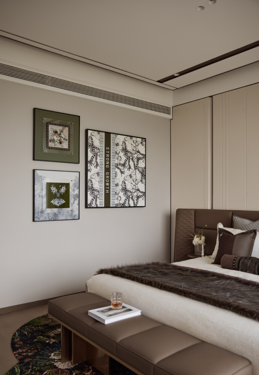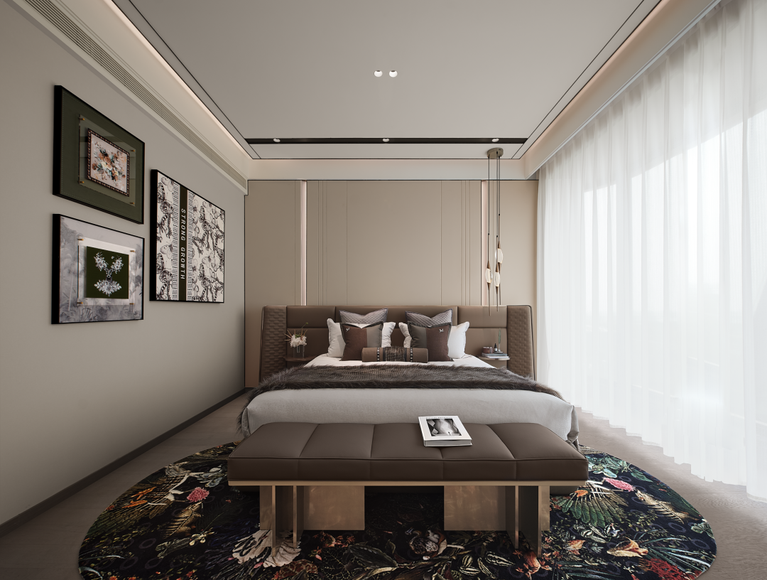 床屏展現(xiàn)著主臥的儀式感,吊燈連接了立體空間,增強(qiáng)臥室的浪漫。