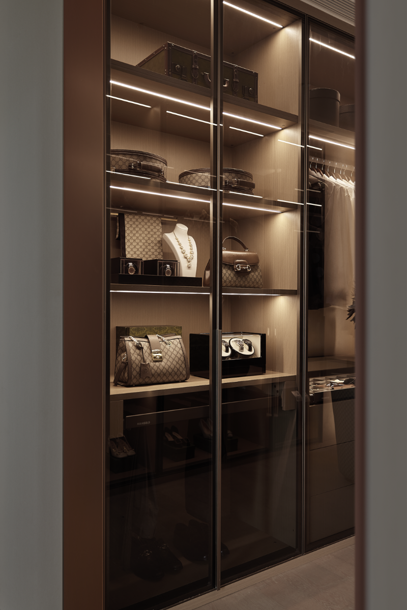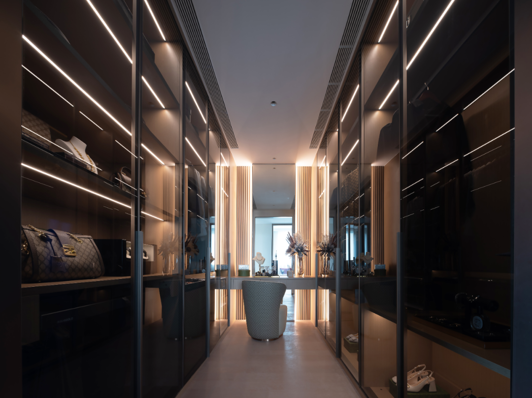 獨(dú)立衣帽間,落地鏡延伸了空間視覺感,同時(shí)做到左右兩側(cè)分區(qū)。