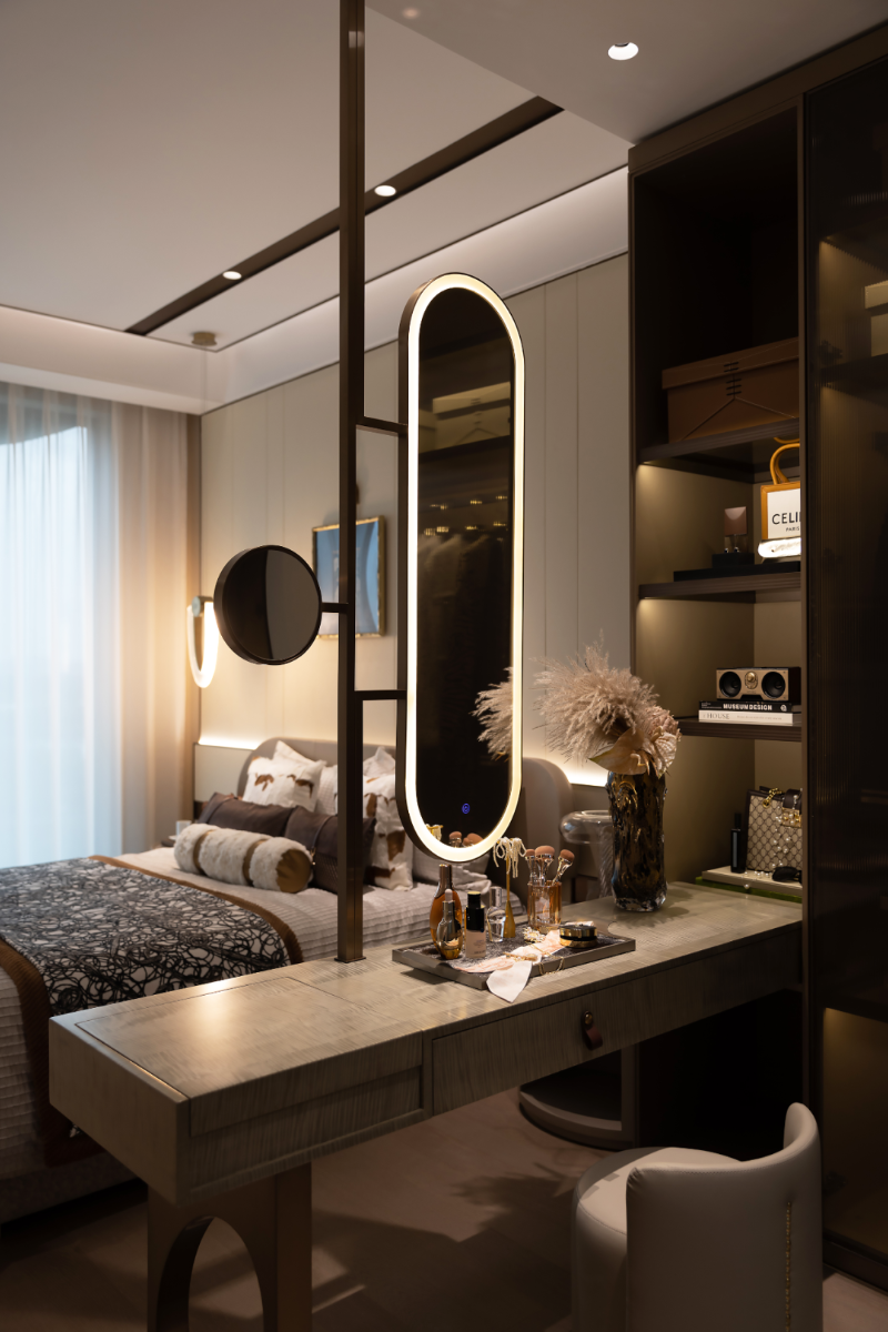 次臥空間利用梳妝臺(tái)巧妙地分隔了睡眠區(qū)和衣帽區(qū),功能多元的同時(shí),強(qiáng)化其通透感。裝飾畫是空間的個(gè)性化表現(xiàn),帶來(lái)活力和視覺焦點(diǎn)。此外地毯和抱枕等軟裝飾品,營(yíng)造出舒適和雅致的居住環(huán)境。