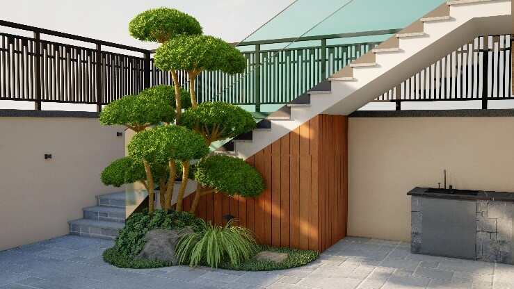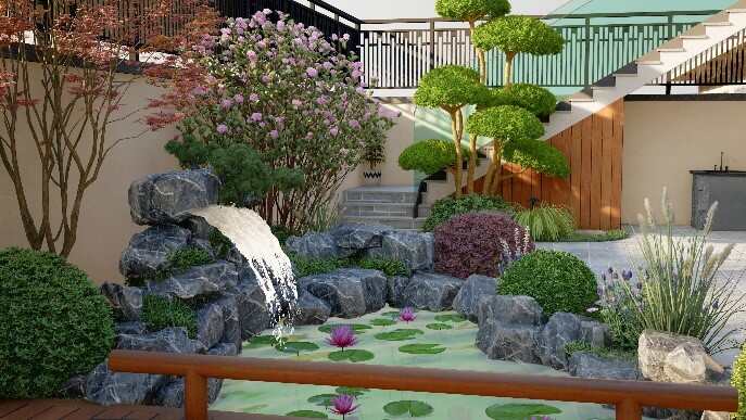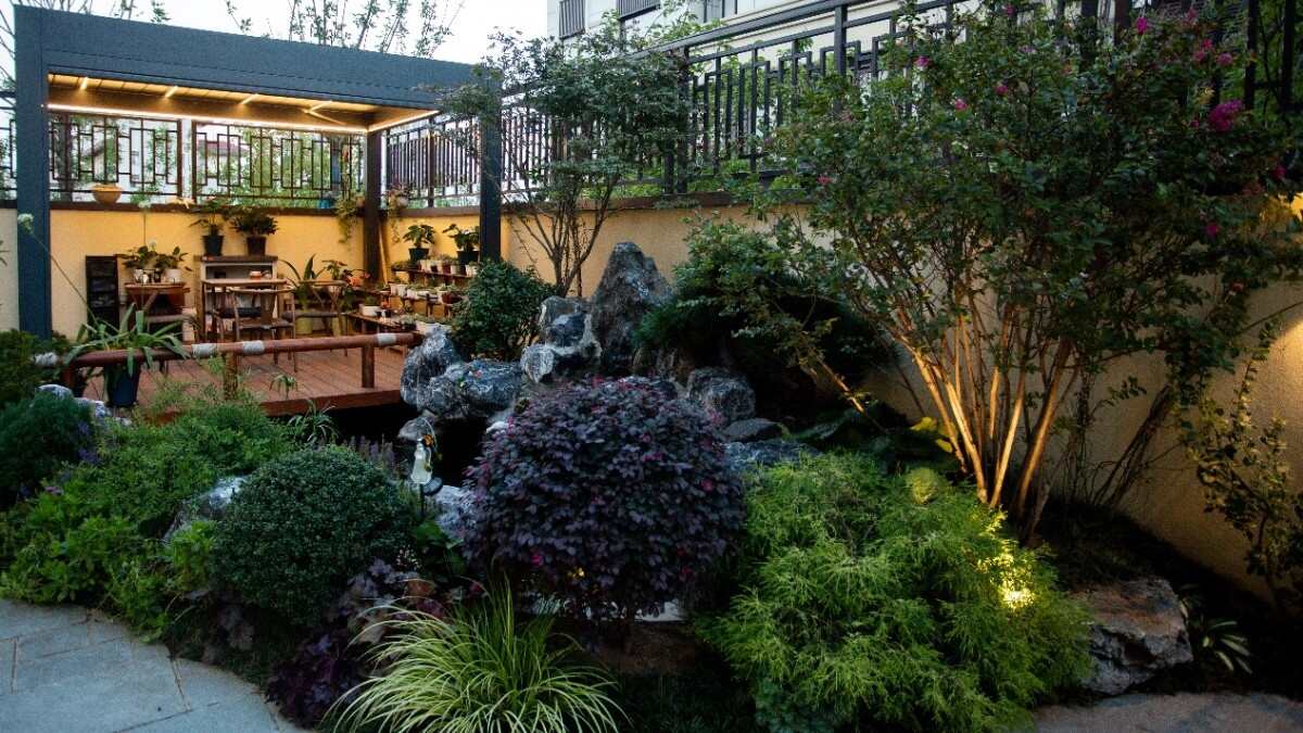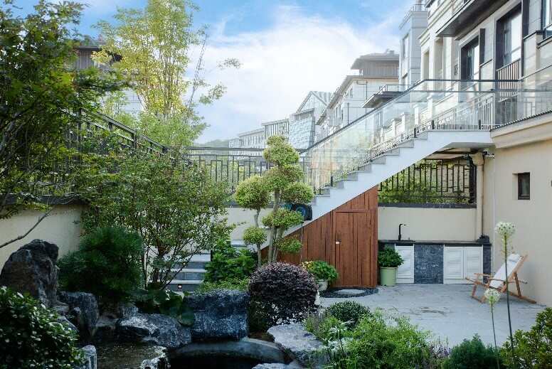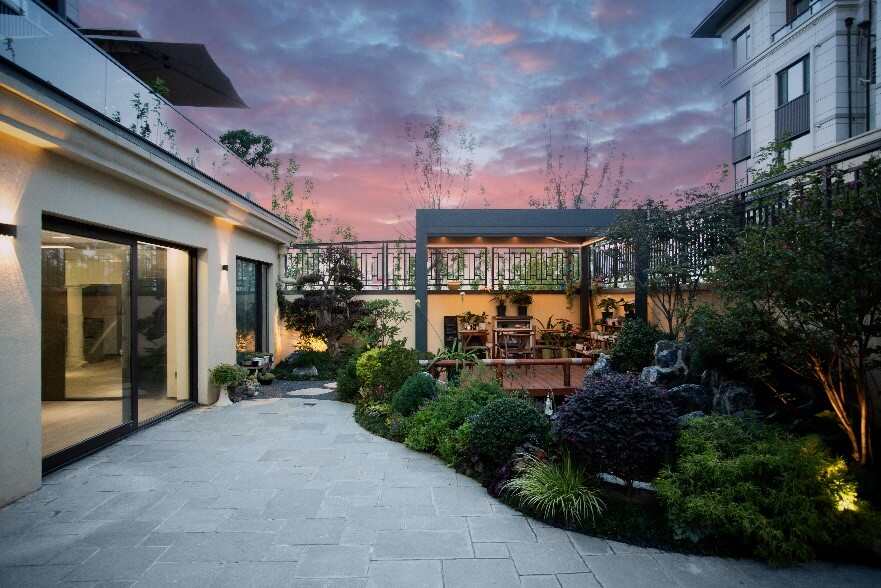 通過這種分層的設(shè)計,庭院在視覺和功能上都實現(xiàn)了多樣化。一層露臺的開放與活力,與負一層下沉式庭院的寧靜與私密,形成了鮮明的對比,但又通過植物的運用和空間的布局,達到了和諧統(tǒng)一。這樣的設(shè)計不僅提升了生活的品質(zhì),也展現(xiàn)了設(shè)計師對于自然與人文的深刻理解和尊重,是對傳統(tǒng)庭院設(shè)計理念的一種創(chuàng)新和延伸。