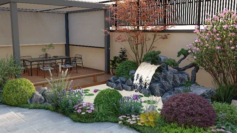 此庭院設(shè)計案例以“自然與和諧”為核心設(shè)計,不僅注重視覺上的美感,更強調(diào)人與自然的和諧共生,營造出一種優(yōu)雅、恬靜的氛圍,花園在空間布局上為“下沉式”庭院,遵循其原則,將視線引向庭院中心,在考慮到私密性的同時即享受自然美景,也能感受到空間的層次感。