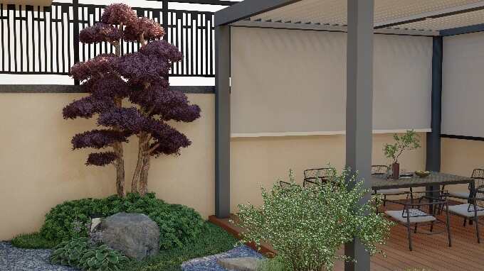 本項目位于山東省煙臺市,花園分為一層(露臺)和負一層(“下沉式”庭院),一層面積64平方米,負一層面積98平方米,周圍環(huán)境蔥蔚洇潤,設(shè)計過程中院子外的植物也發(fā)揮了不可或缺的作用。四季常青的植物裝點著周圍環(huán)境,為整個庭院增添了一份生機與活力。它們與下沉式庭院內(nèi)的靜謐環(huán)境形成互補,使整個庭院在動靜之間達到和諧統(tǒng)一。設(shè)計理念: