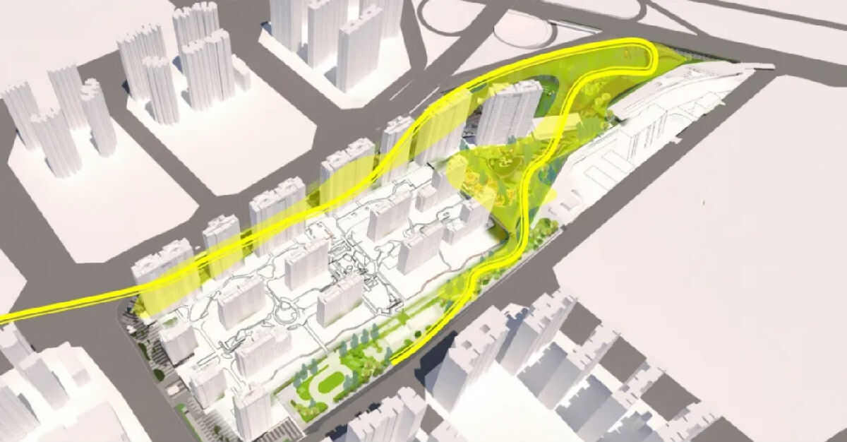 鄭軌·云麓,位于鄭州五號地鐵線五龍口站停車場之上,像一個(gè)巨大的諾亞方舟懸浮在城市天際,是鄭州首個(gè)以軌道交通站點(diǎn)為中心,集工作、消費(fèi)、文教、居住四大核心功能于一體的地鐵上蓋TOD綜合體項(xiàng)目,被一條自東向西蜿蜒伸展的U型公園溫柔環(huán)抱,彼此分離卻又彼此滲透,和諧共生。