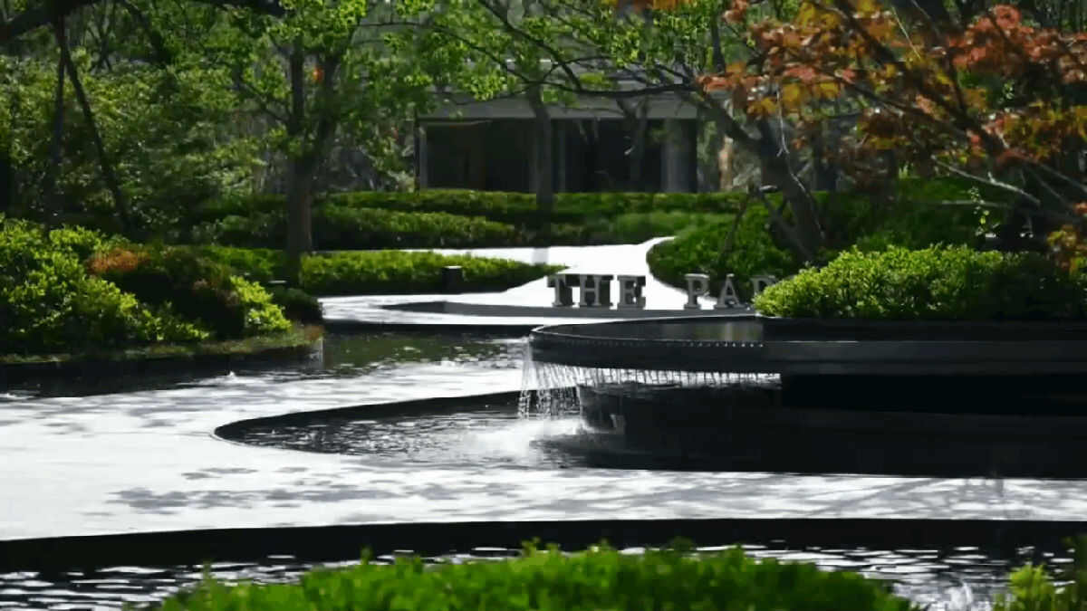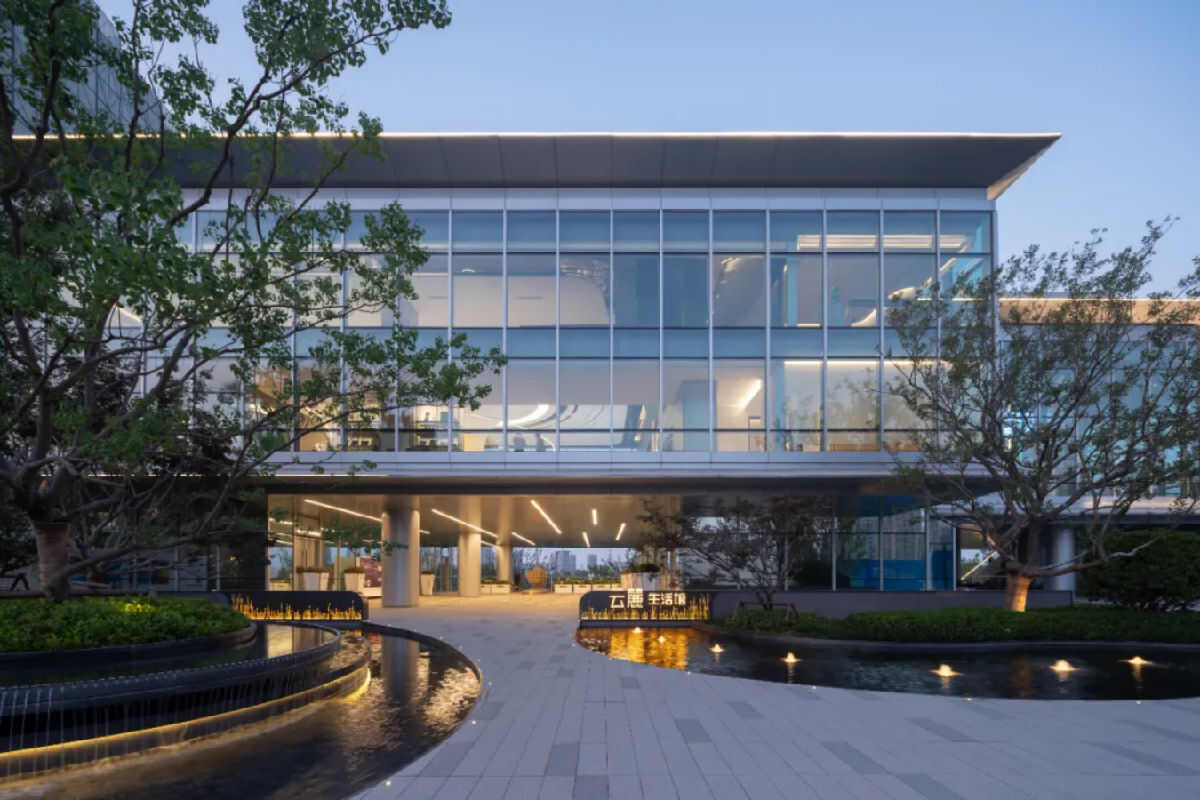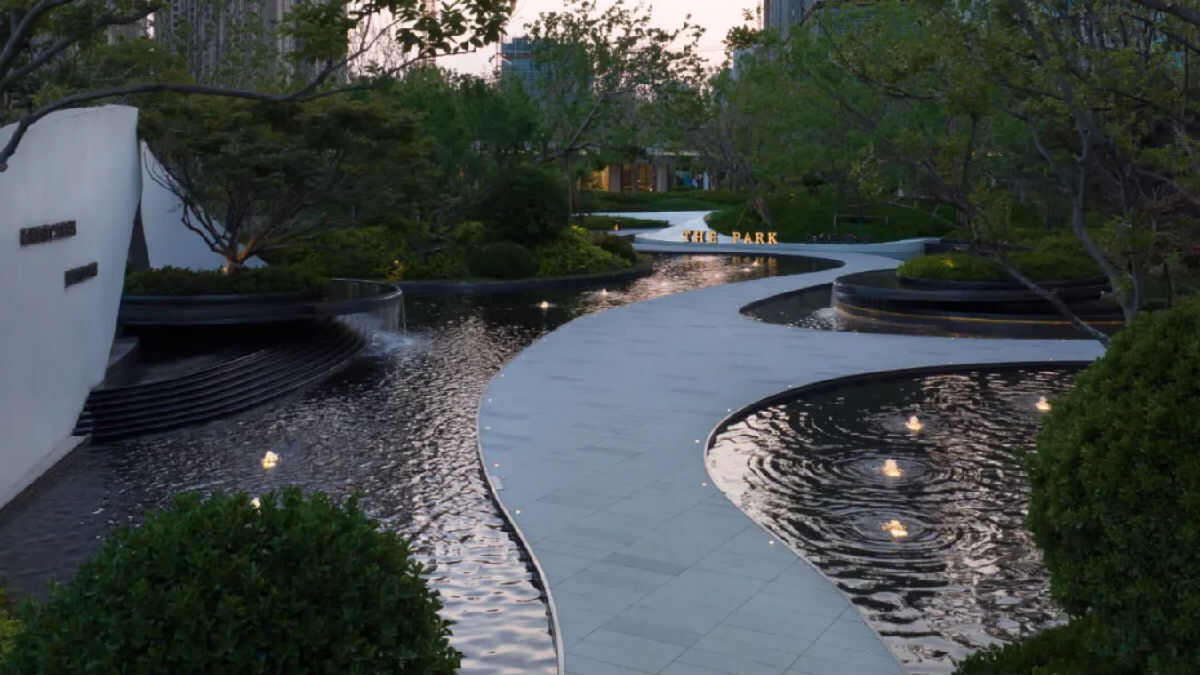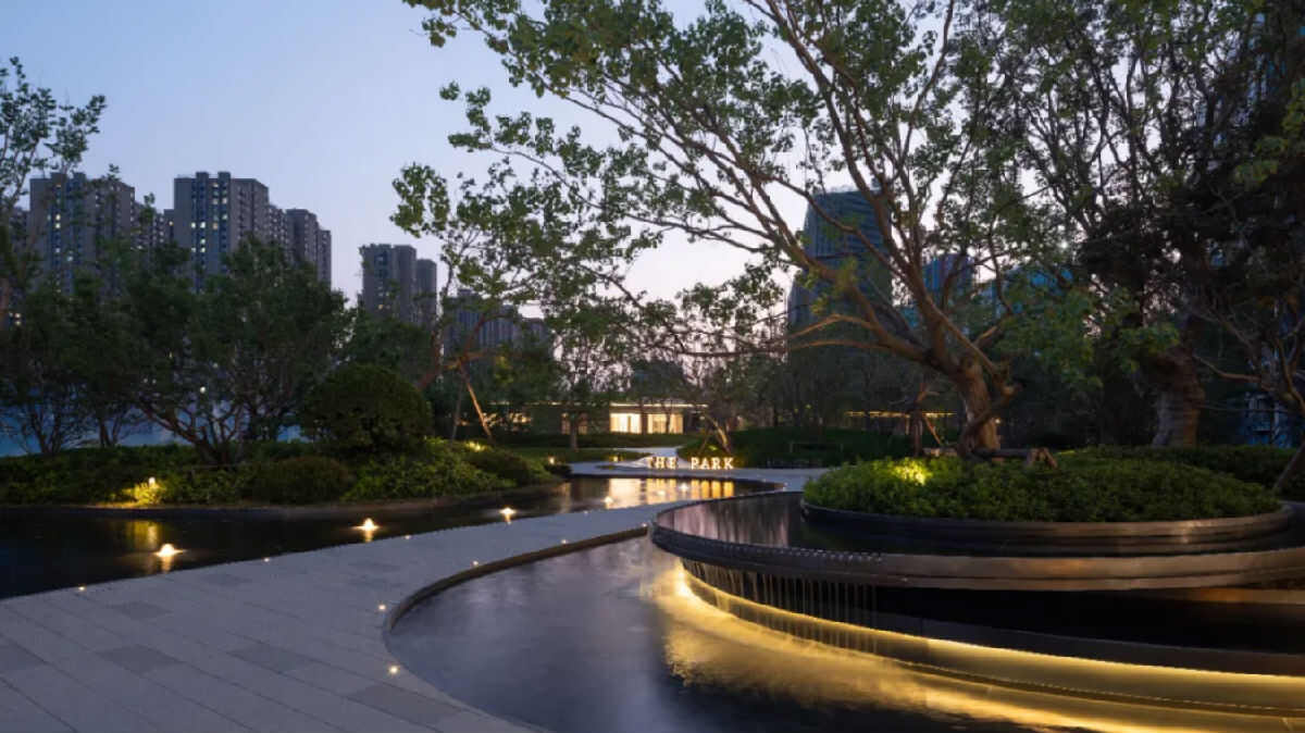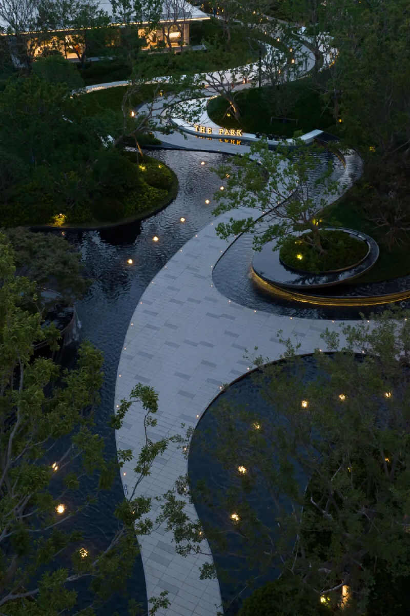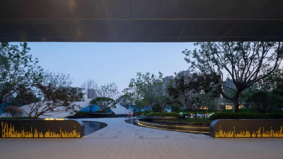 空間節(jié)奏在悄無聲息中變化融合,水景映畫出天空與草地,一路婉轉(zhuǎn)流淌引人入勝,宛如步入云谷之間,城市剪影也隨著云谷起伏若隱若現(xiàn)。