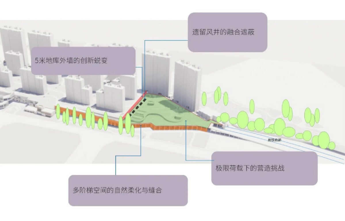 項(xiàng)目用地東、南、北三個(gè)方向均存在7米斷崖式高差,邊界生硬,環(huán)境融合較難,西側(cè)地庫側(cè)墻高聳,既增加了空間的壓迫感,又阻斷了示范區(qū)與大區(qū)之間的聯(lián)通,一整排2米高的通風(fēng)井,更是影響了重點(diǎn)區(qū)域的氛圍營造,加之項(xiàng)目屬于地鐵上蓋性質(zhì),在荷載、防水、排水等條件上的限制更為嚴(yán)苛,因此在設(shè)計(jì)中,更加需要設(shè)計(jì)團(tuán)隊(duì)深諳現(xiàn)狀,精準(zhǔn)洞察,因地制宜使項(xiàng)目完美落地。