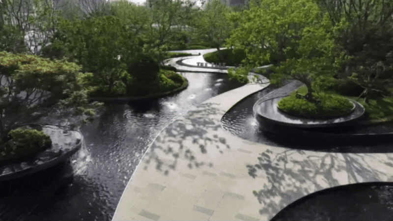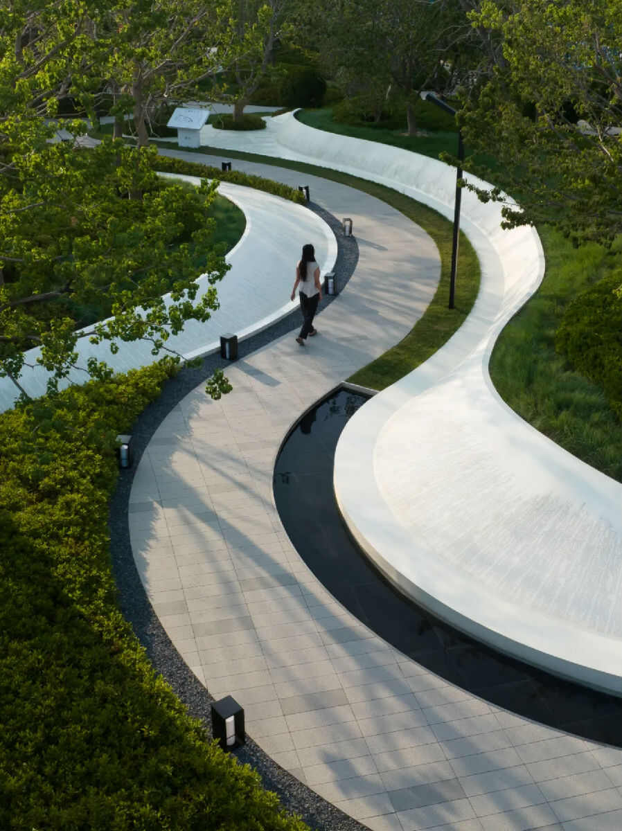 水上步道像一條潔白的云上飄帶,無限放大著空間的感受,弧線景墻呈現(xiàn)出云的特質(zhì),輕柔,潔白、飄逸,雙曲面的景墻設(shè)計(jì)盡顯工藝精湛。蜿蜒曲折的動線結(jié)合高低起伏的綠植地形,將人們渴望的自由之境體現(xiàn)的淋漓盡致,此時(shí),自然與城市握手言和,TOD之上,云麓之間,愜意與便利兼得。