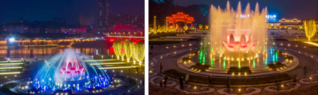上圖:中心蓮花廣場主題雕塑音樂噴泉水景,呈現(xiàn)效果包括燈光、噴泉、音樂,花瓣的開合,蓮花花蕊的升降。