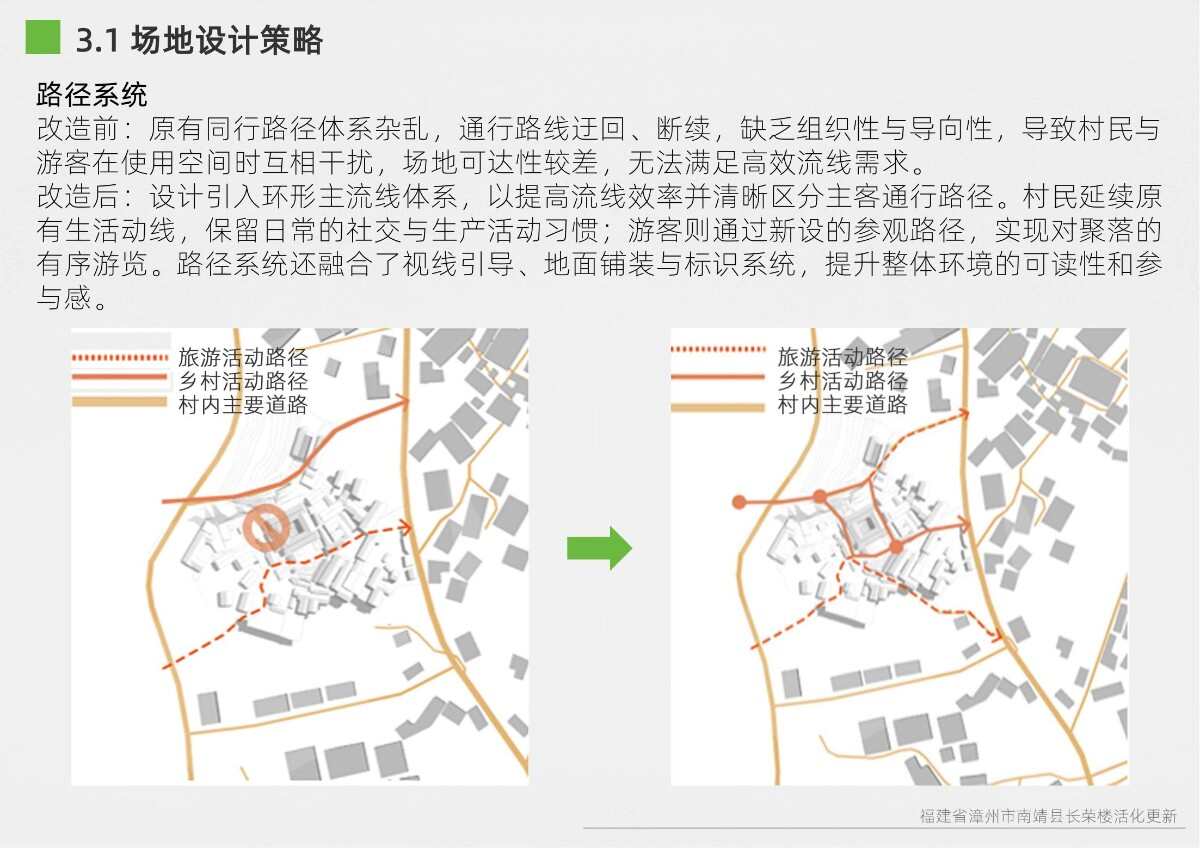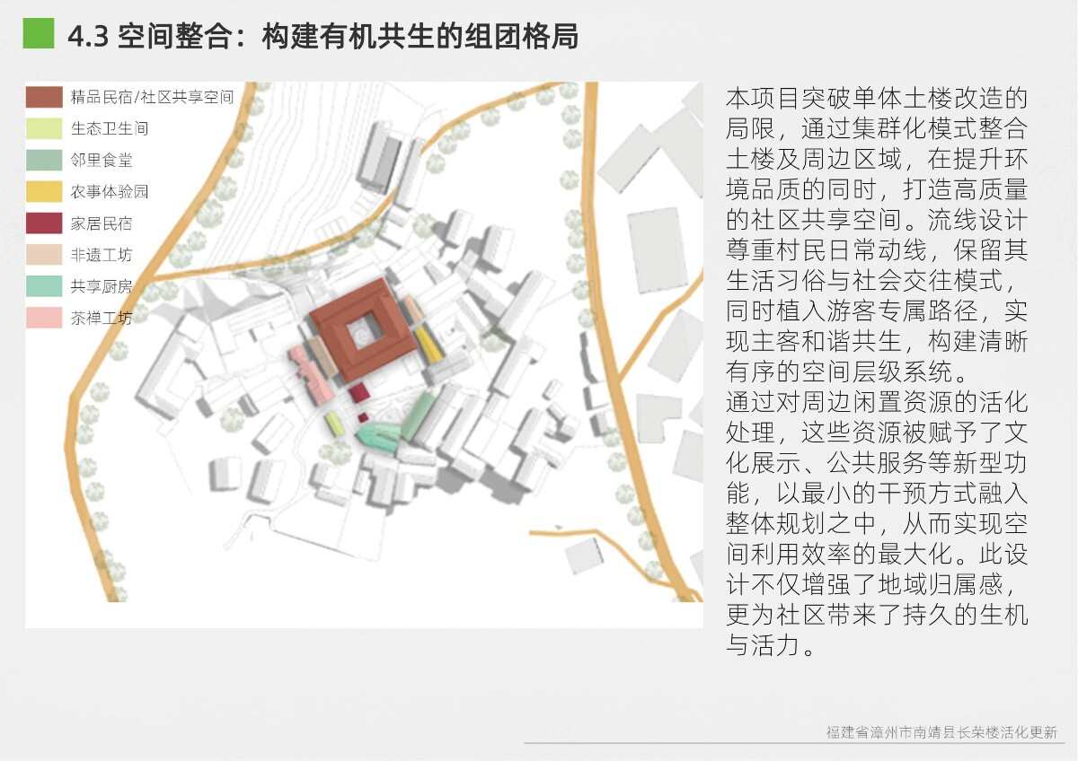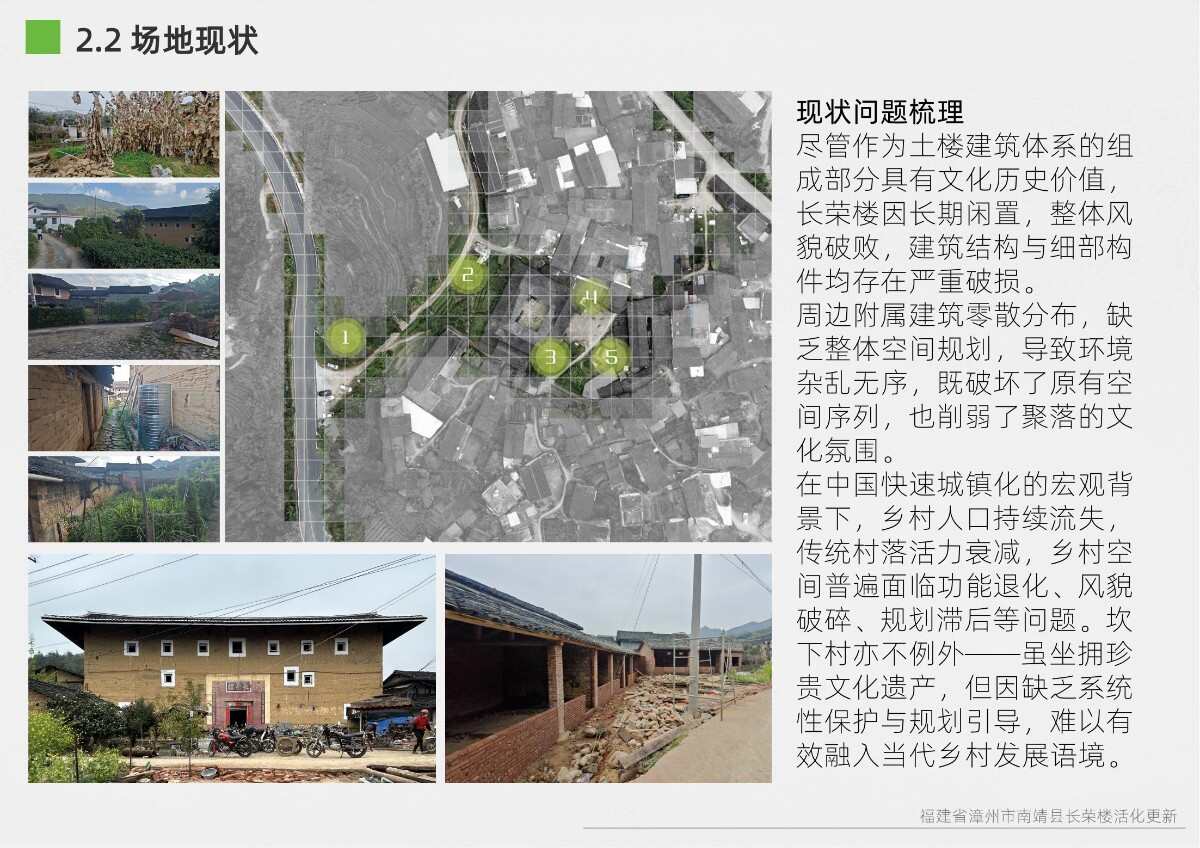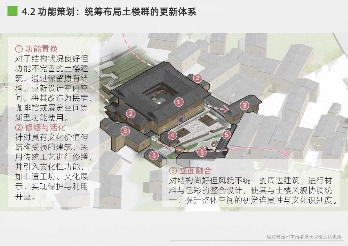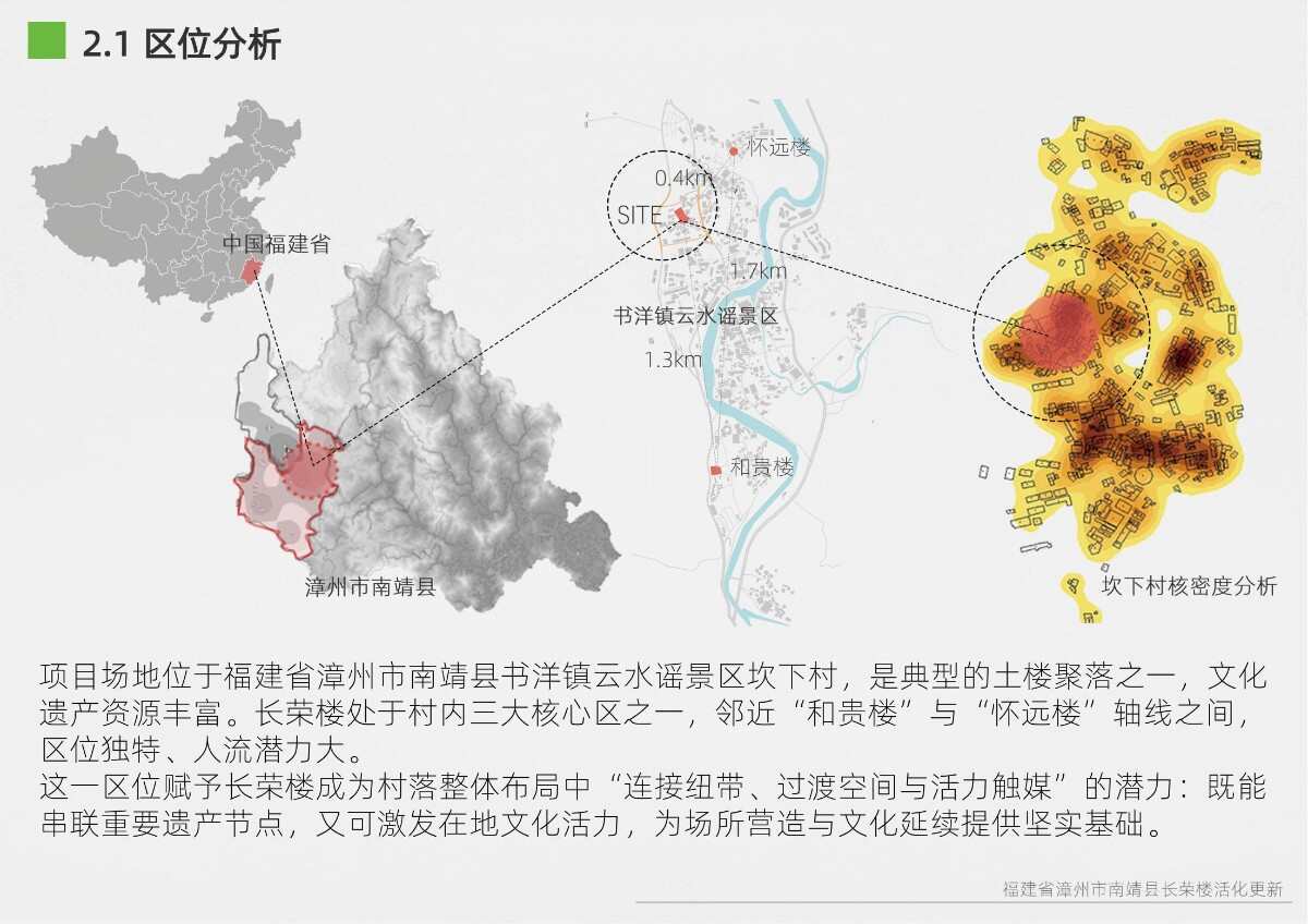 本項目選址于福建省漳州市南靖縣書洋鎮(zhèn)云水謠景區(qū)坎下村,以世界遺產(chǎn)背景下的土樓聚落為研究與設(shè)計對象。場地核心建筑為長榮樓,位于和貴樓與懷遠(yuǎn)樓之間的軸線要地,具有獨(dú)特的區(qū)位優(yōu)勢與文化關(guān)聯(lián)性。項目以“保護(hù)與活化并重”為原則,突破單體改造局限,采用集群化更新模式,將土樓與周邊閑置空間統(tǒng)籌規(guī)劃。 設(shè)計通過優(yōu)化路徑系統(tǒng)、重構(gòu)節(jié)點(diǎn)體系、整合功能分區(qū)與界面改造,實現(xiàn)游客與村民的分流共生,增強(qiáng)空間秩序與文化體驗。同時,項目引入民宿改造、文化展示、公共共享與產(chǎn)業(yè)植入等功能,推動社區(qū)參與與可持續(xù)運(yùn)營。長榮樓在這一過程中不僅承擔(dān)多功能公共場所角色,更成為連接遺產(chǎn)節(jié)點(diǎn)、傳承地方文化與激發(fā)社區(qū)活力的重要媒介。