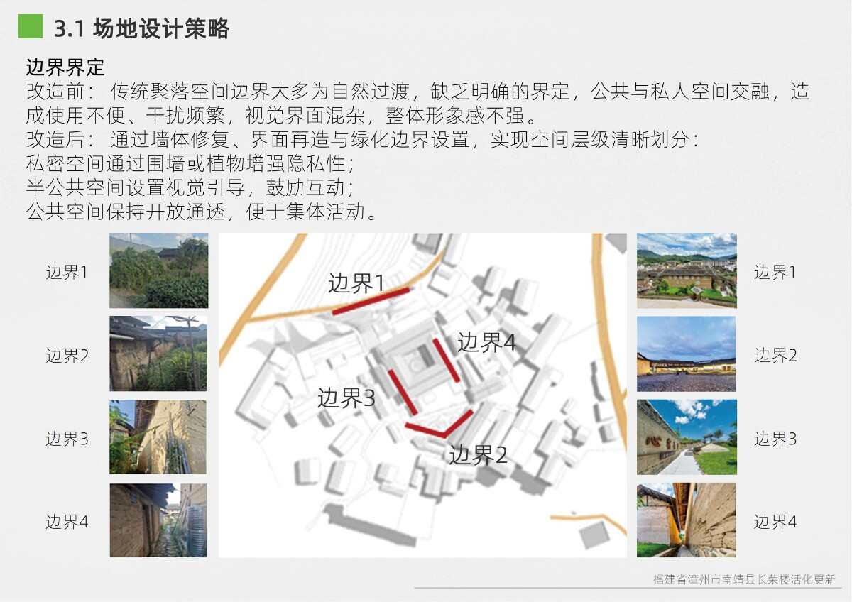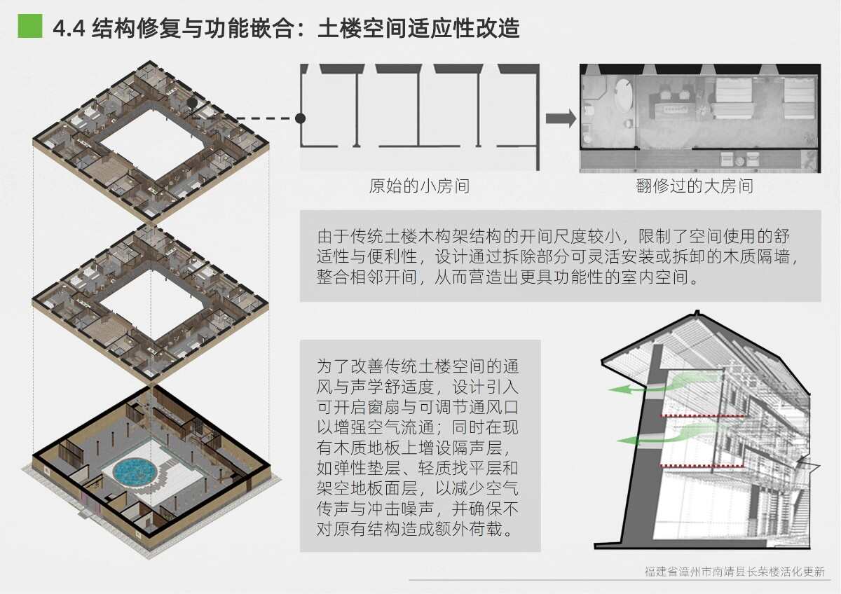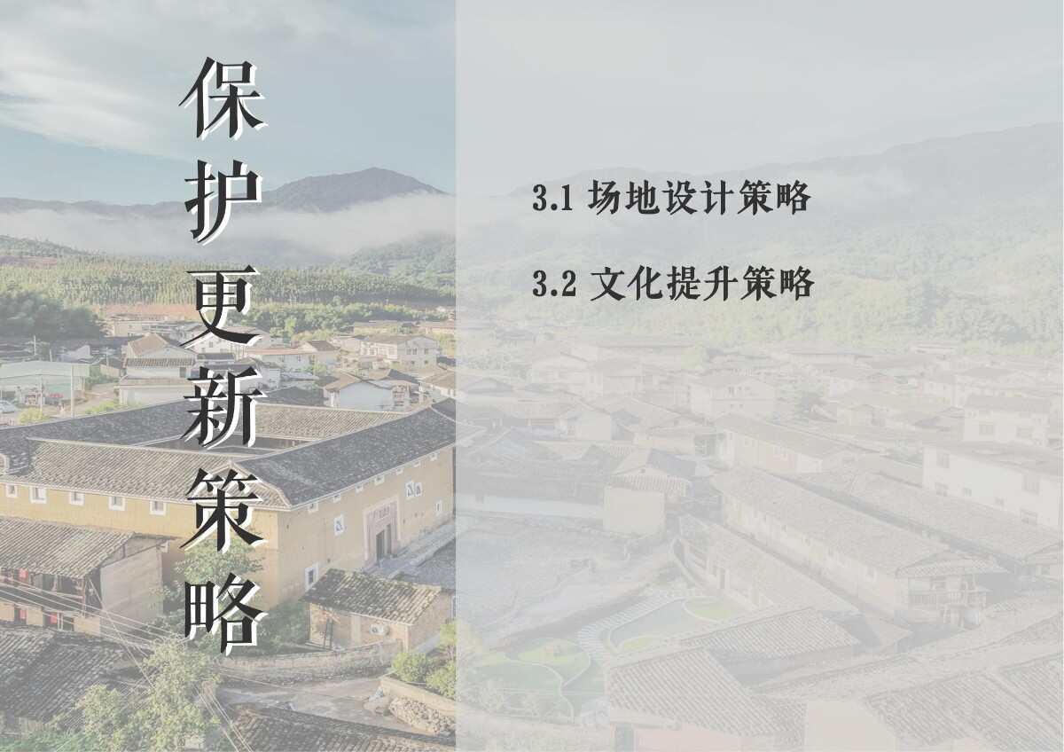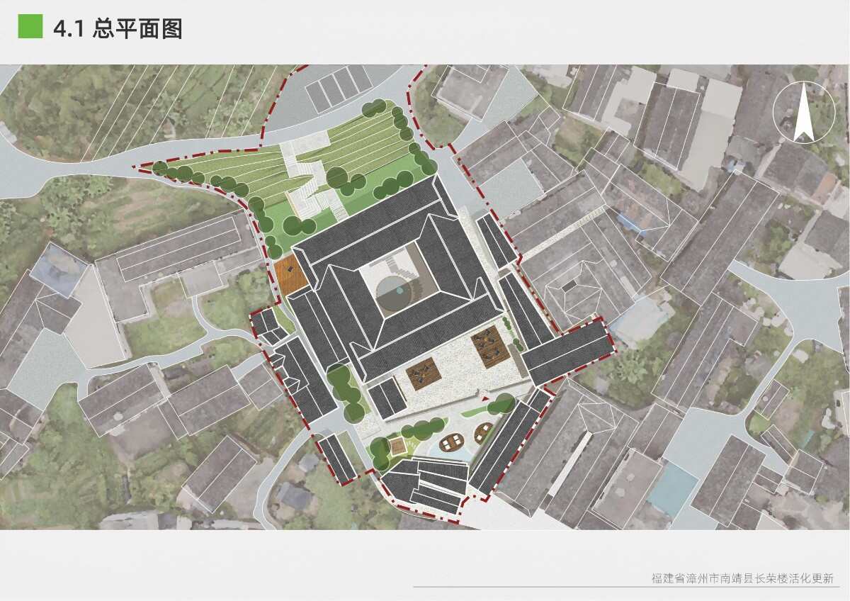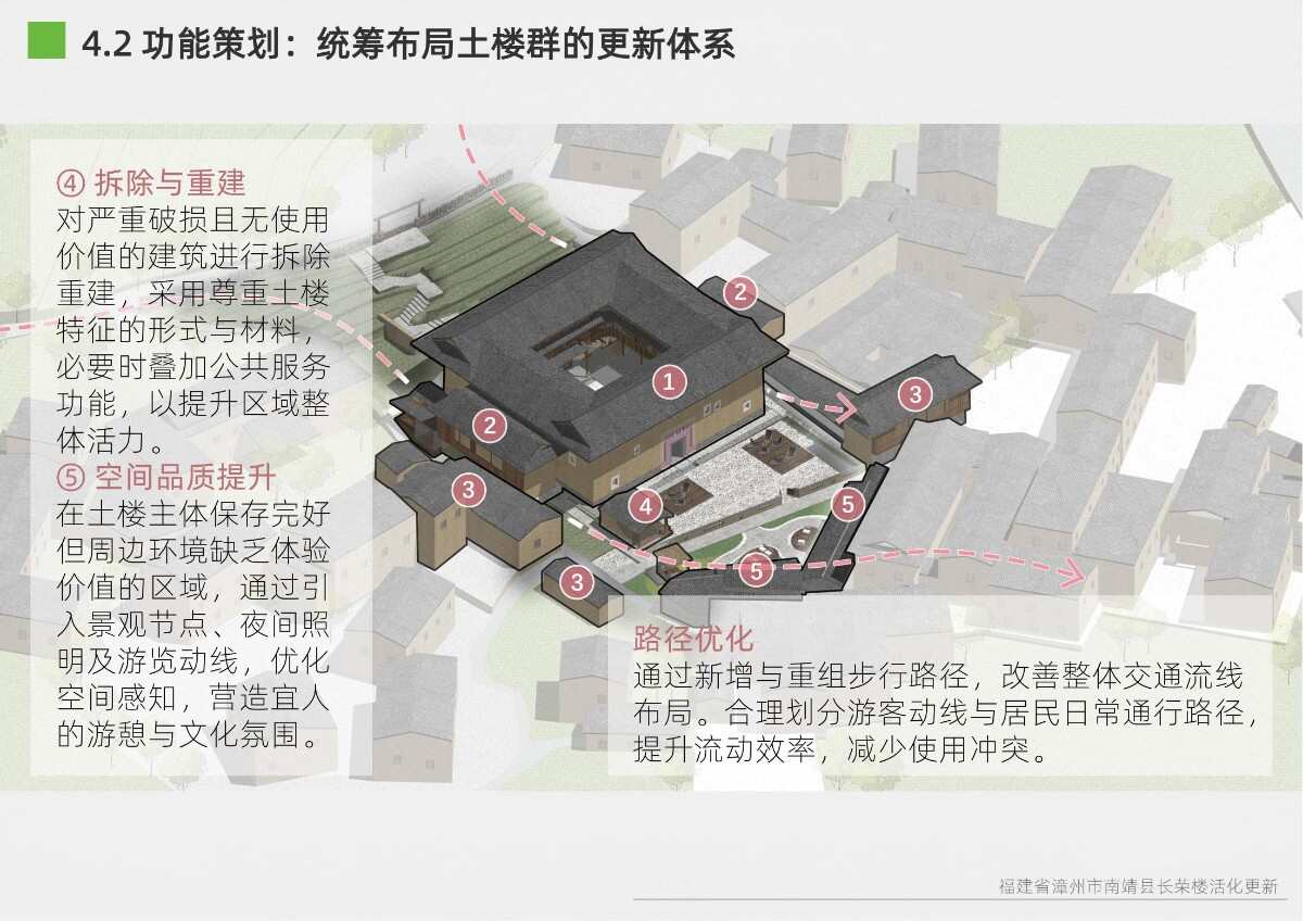 本項目選址于福建省漳州市南靖縣書洋鎮(zhèn)云水謠景區(qū)坎下村,以世界遺產(chǎn)背景下的土樓聚落為研究與設(shè)計對象。場地核心建筑為長榮樓,位于和貴樓與懷遠(yuǎn)樓之間的軸線要地,具有獨(dú)特的區(qū)位優(yōu)勢與文化關(guān)聯(lián)性。項目以“保護(hù)與活化并重”為原則,突破單體改造局限,采用集群化更新模式,將土樓與周邊閑置空間統(tǒng)籌規(guī)劃。 設(shè)計通過優(yōu)化路徑系統(tǒng)、重構(gòu)節(jié)點(diǎn)體系、整合功能分區(qū)與界面改造,實現(xiàn)游客與村民的分流共生,增強(qiáng)空間秩序與文化體驗。同時,項目引入民宿改造、文化展示、公共共享與產(chǎn)業(yè)植入等功能,推動社區(qū)參與與可持續(xù)運(yùn)營。長榮樓在這一過程中不僅承擔(dān)多功能公共場所角色,更成為連接遺產(chǎn)節(jié)點(diǎn)、傳承地方文化與激發(fā)社區(qū)活力的重要媒介。