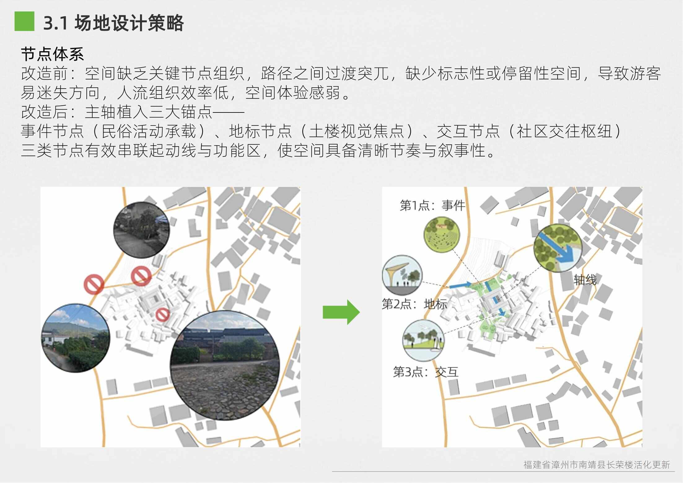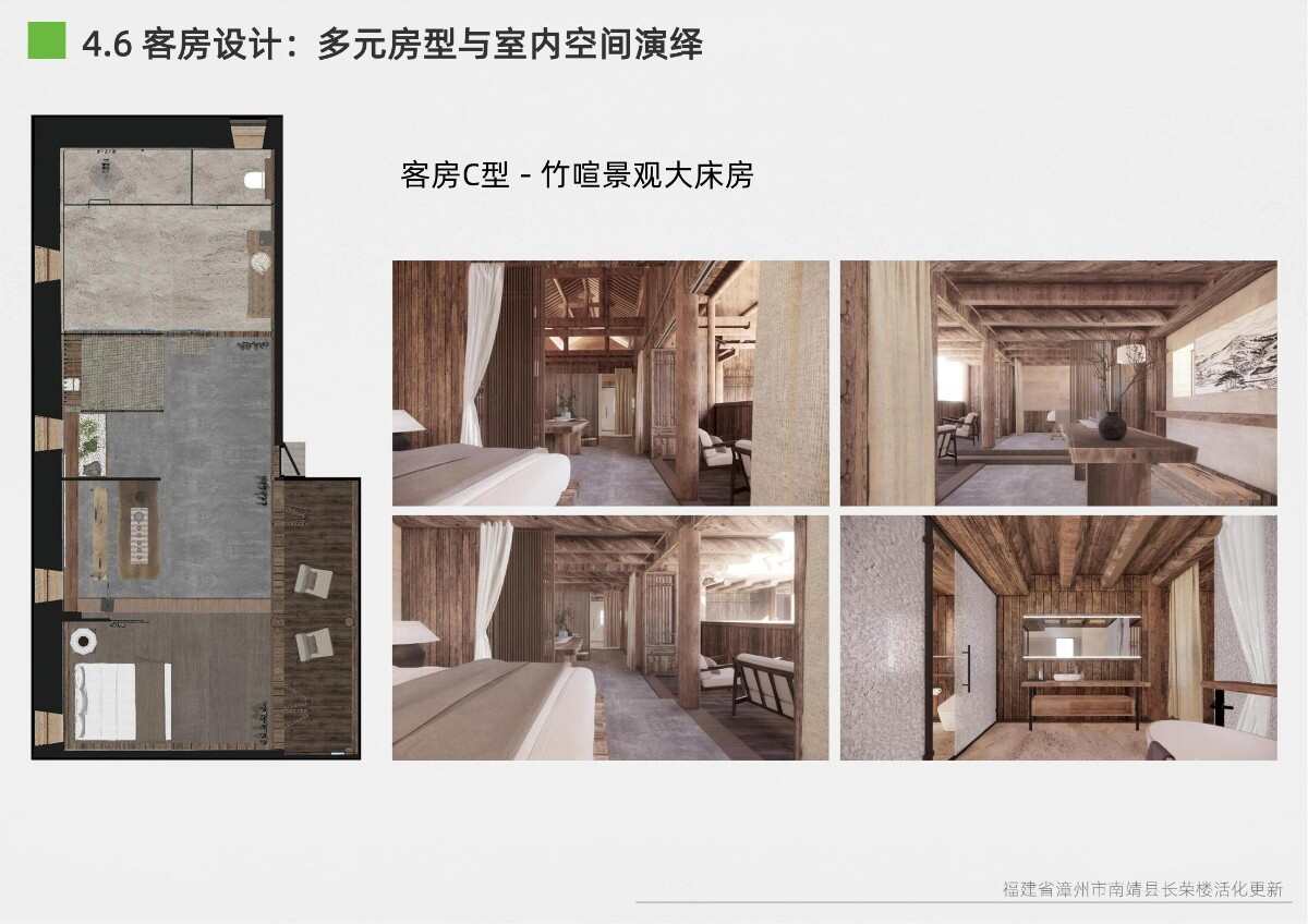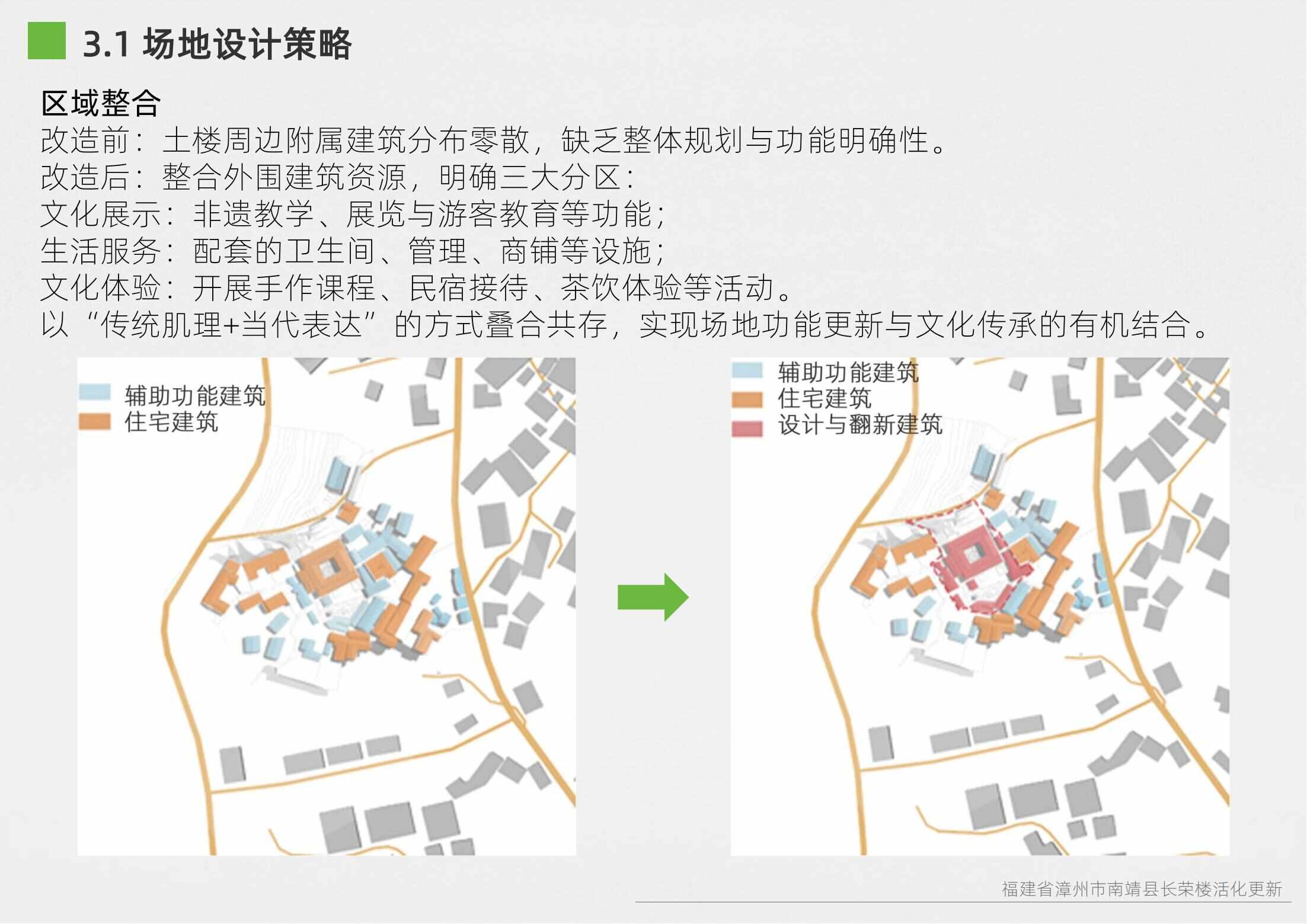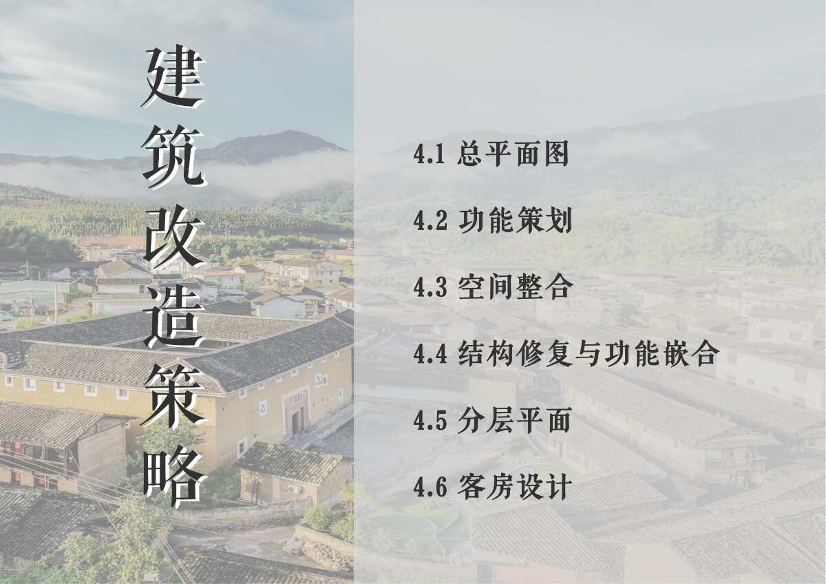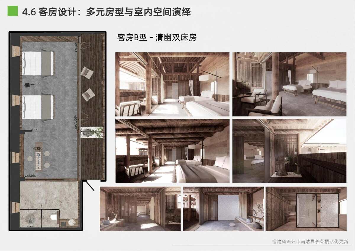 本項目選址于福建省漳州市南靖縣書洋鎮(zhèn)云水謠景區(qū)坎下村,以世界遺產(chǎn)背景下的土樓聚落為研究與設(shè)計對象。場地核心建筑為長榮樓,位于和貴樓與懷遠(yuǎn)樓之間的軸線要地,具有獨(dú)特的區(qū)位優(yōu)勢與文化關(guān)聯(lián)性。項目以“保護(hù)與活化并重”為原則,突破單體改造局限,采用集群化更新模式,將土樓與周邊閑置空間統(tǒng)籌規(guī)劃。 設(shè)計通過優(yōu)化路徑系統(tǒng)、重構(gòu)節(jié)點(diǎn)體系、整合功能分區(qū)與界面改造,實現(xiàn)游客與村民的分流共生,增強(qiáng)空間秩序與文化體驗。同時,項目引入民宿改造、文化展示、公共共享與產(chǎn)業(yè)植入等功能,推動社區(qū)參與與可持續(xù)運(yùn)營。長榮樓在這一過程中不僅承擔(dān)多功能公共場所角色,更成為連接遺產(chǎn)節(jié)點(diǎn)、傳承地方文化與激發(fā)社區(qū)活力的重要媒介。