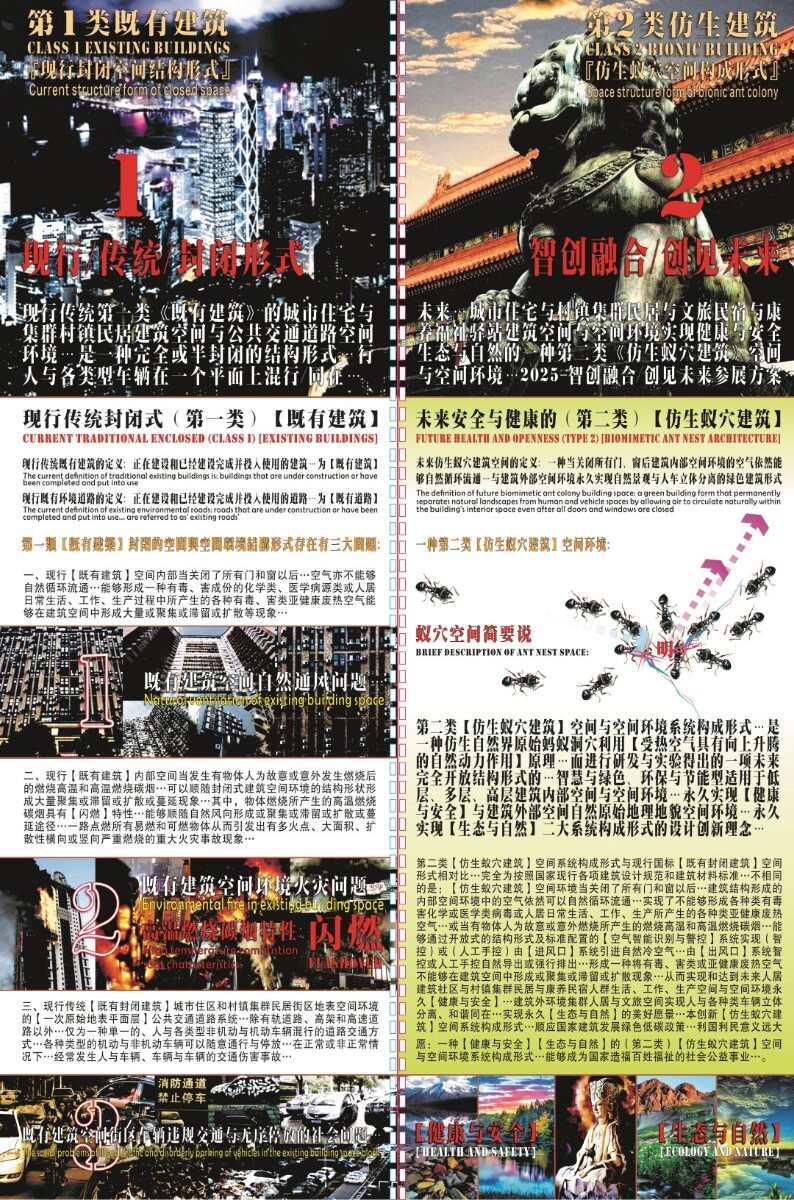 作為一名長(zhǎng)期致力于人居環(huán)境創(chuàng)新的研究者,我深知傳統(tǒng)封閉建筑在健康、安全與生態(tài)上的固有缺陷。受億萬年演化的蟻穴智慧啟發(fā),我?guī)ьI(lǐng)團(tuán)隊(duì)基于三項(xiàng)國(guó)家發(fā)明專利,研發(fā)了“仿生蟻穴建筑系統(tǒng)”。 該系統(tǒng)以“中央通風(fēng)豎井”為核心,構(gòu)建建筑的“自然肺”,實(shí)現(xiàn)無需動(dòng)力的持續(xù)新風(fēng)與緊急排煙;并通過“人車立體分離”規(guī)劃,將地表徹底釋放于自然與行人,從根源上杜絕人車混行。我們以智能系統(tǒng)賦能傳統(tǒng)匠藝,融合地域文化,最終打造出一個(gè)能自由呼吸、絕對(duì)安全、生態(tài)永續(xù)的未來生命建筑體。這不僅是一項(xiàng)技術(shù)集成,更是向自然學(xué)習(xí)的智慧實(shí)踐,旨在為每一個(gè)城市與村落帶來真正健康、和諧的人居未來。在我國(guó)城鄉(xiāng)仍廣泛存在的第一類“既有建筑”模式下,我們面臨著三大核心矛盾: