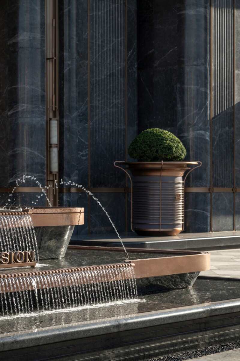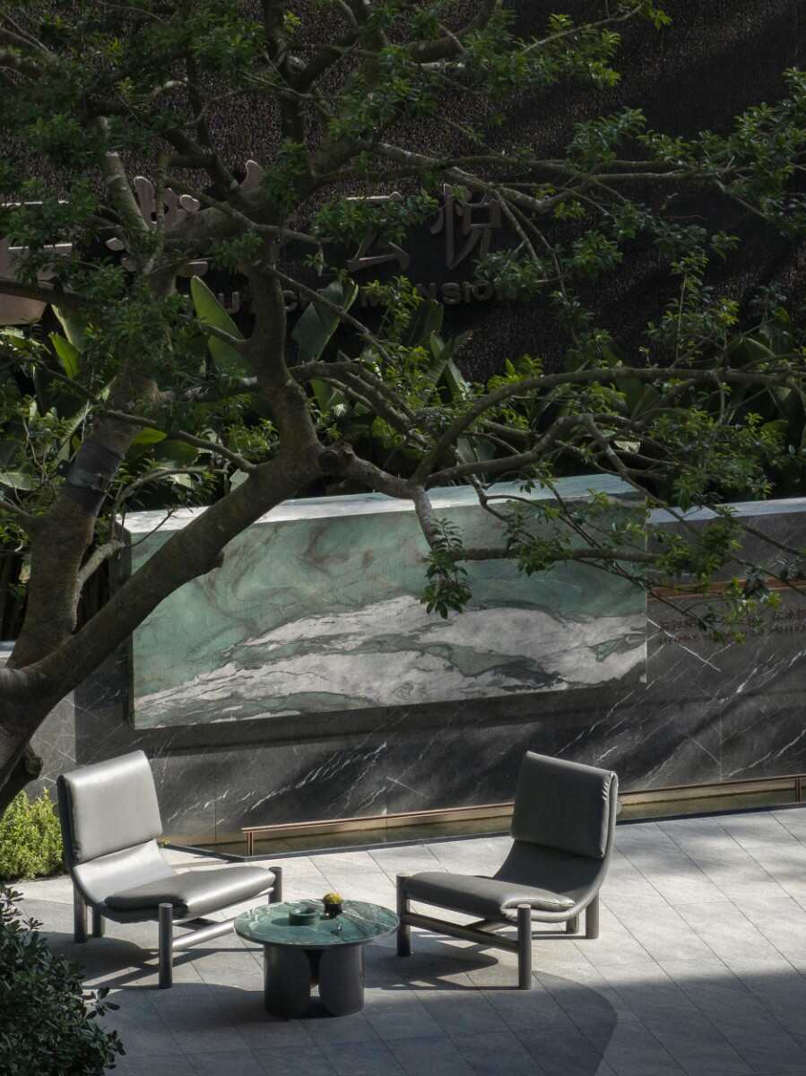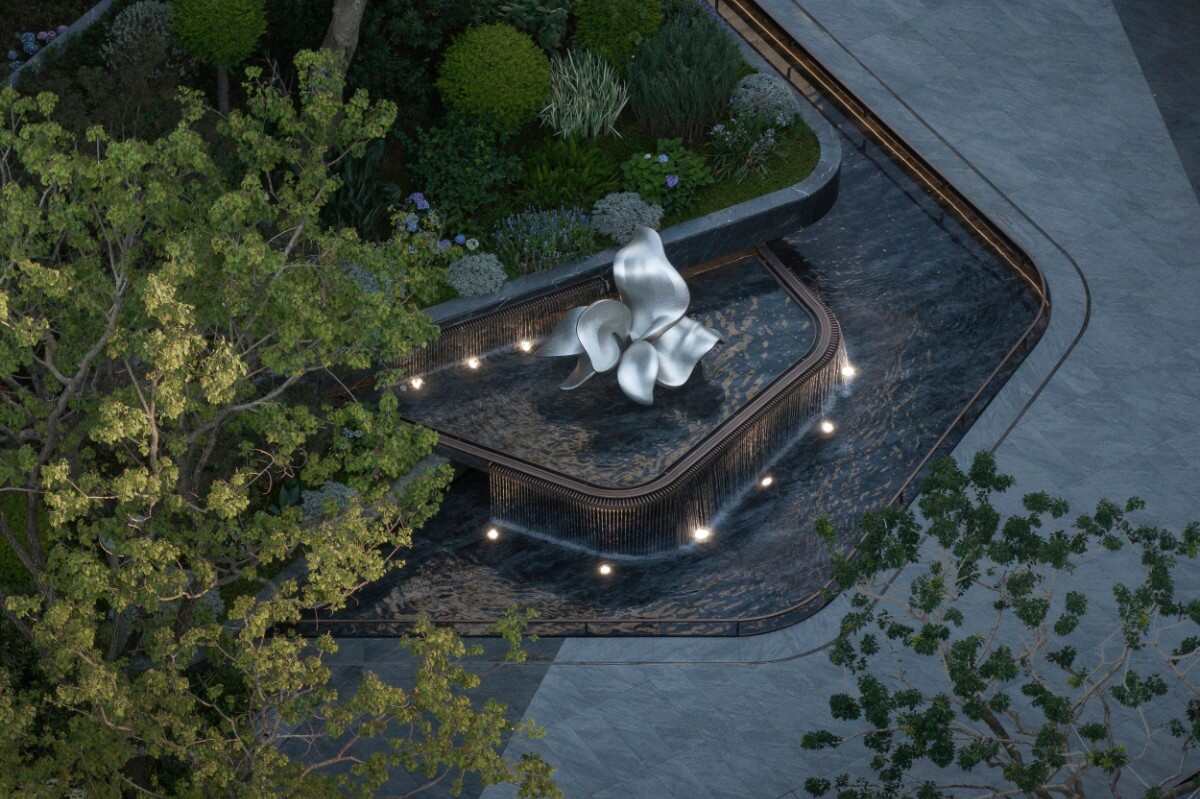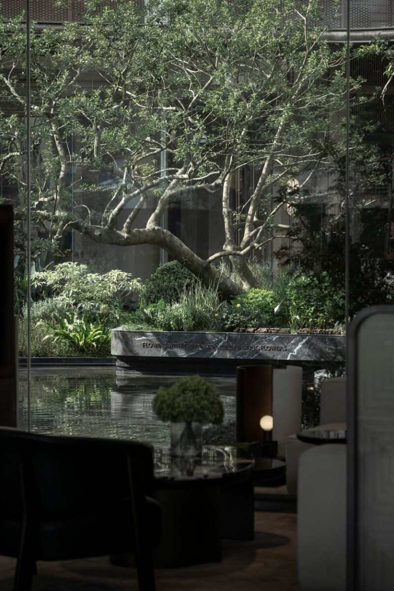 業(yè)主步入大門(mén)后,空間逐級(jí)遞進(jìn),喧囂漸遠(yuǎn),歸屬感油然而生。鏡面水景與名貴烏桕樹(shù)陣相映成趣,以極簡(jiǎn)設(shè)計(jì)語(yǔ)匯營(yíng)造自然靜謐之境。水的溫潤(rùn)與樹(shù)的清雅,共同勾勒出充滿愉悅與寧?kù)o的歸家體驗(yàn)。